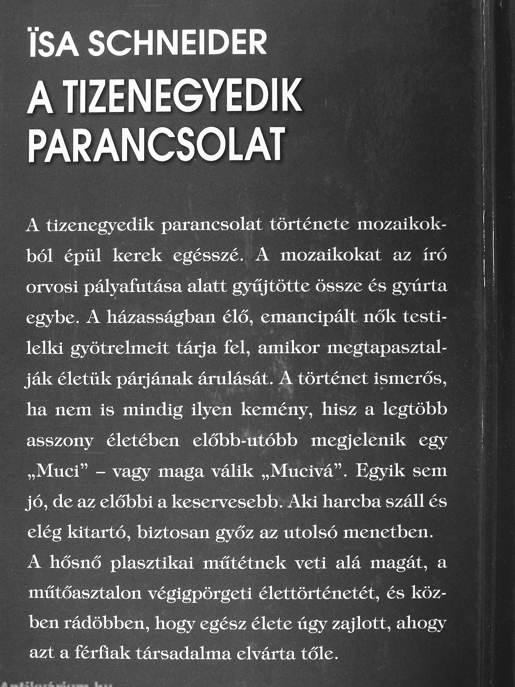 A tizenegyedik parancsolat története mozaikokból épül kerek egésszé. A mozaikokat az író orvosi pályafutása alatt gyűjtötte össze és gyúrta egybe. A házasságban élő, emancipált nők testilelki gyötrelmeit tárja fel, amikor megtapasztalják életük párjának árulását. A történet ismerős, ha nem is mindig ilyen kemény, hisz a legtöbb asszony életében előbb-utóbb megjelenik egy „Muci" - vagy maga válik „Mucivá". Egyik sem jó, de az előbbi a keservesebb. Aki harcba száll és elég kitartó, biztosan győz az utolsó menetben. A hősnő plasztikai műtétnek veti alá magát, a műtőasztalon végigpörgeti élettörténetét, és közben rádöbben, hogy egész élete úgy zajlott, ahogy azt a férfiak társadalma elvárta tőle.