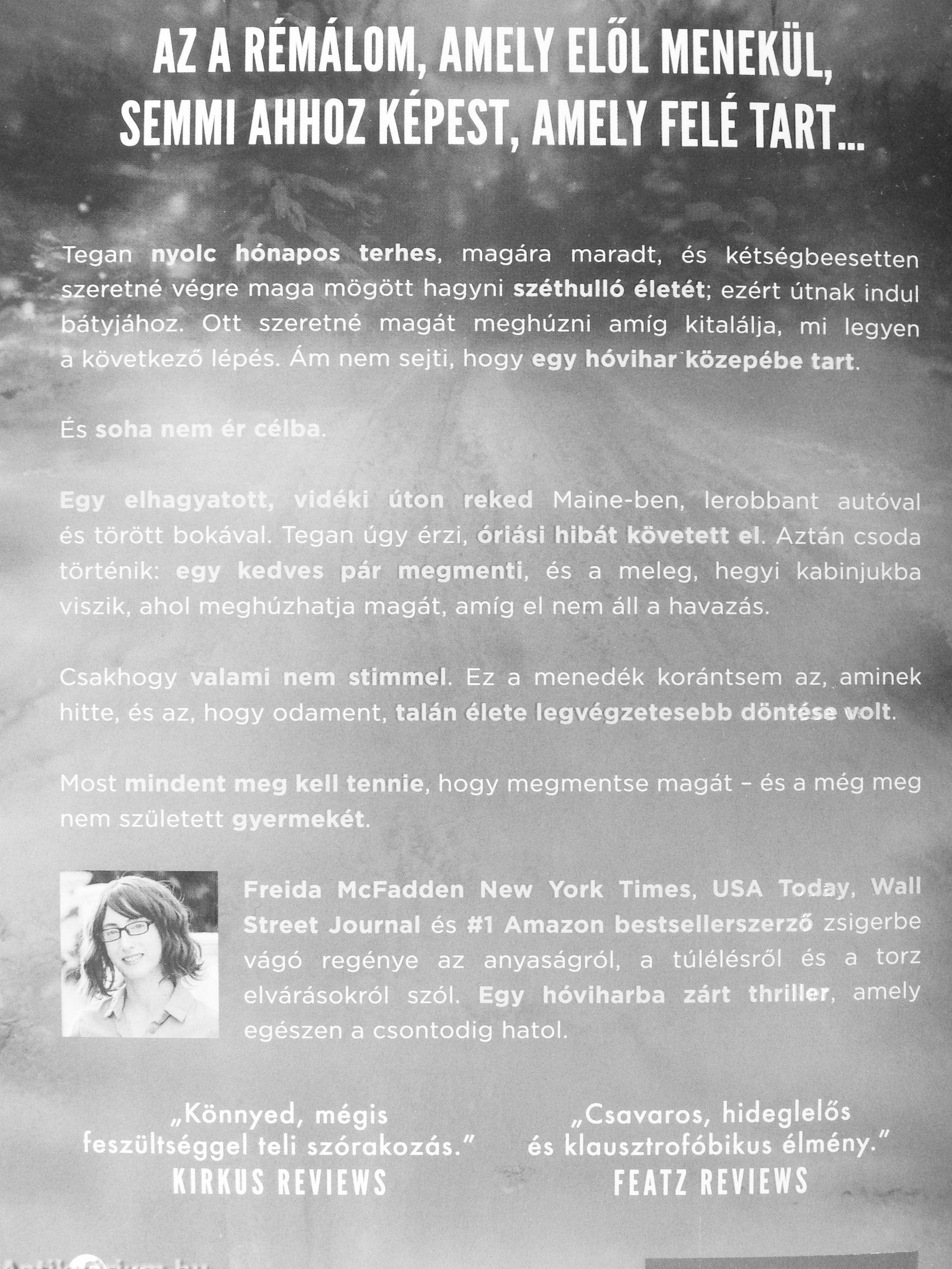 Freida McFadden New York Times, USA Today, Wall íet Journal és #1 Amazon bestsellerszerző zsigerbe ó regénye az anyaságról, a túlélésről és a torz Ríárásokról szól. Egy hóviharba zárt thriiter, amely gészen a csontodig hatol.