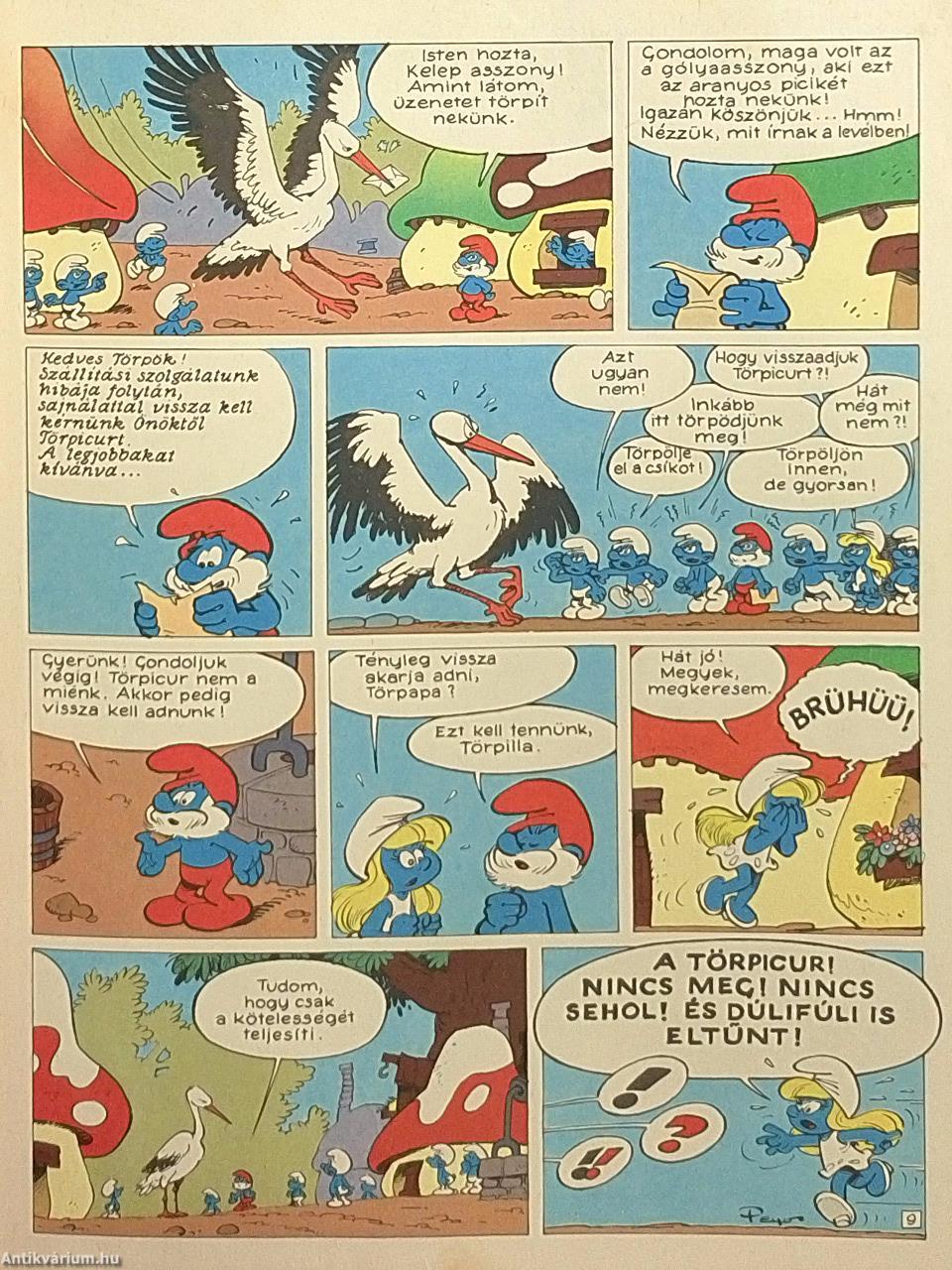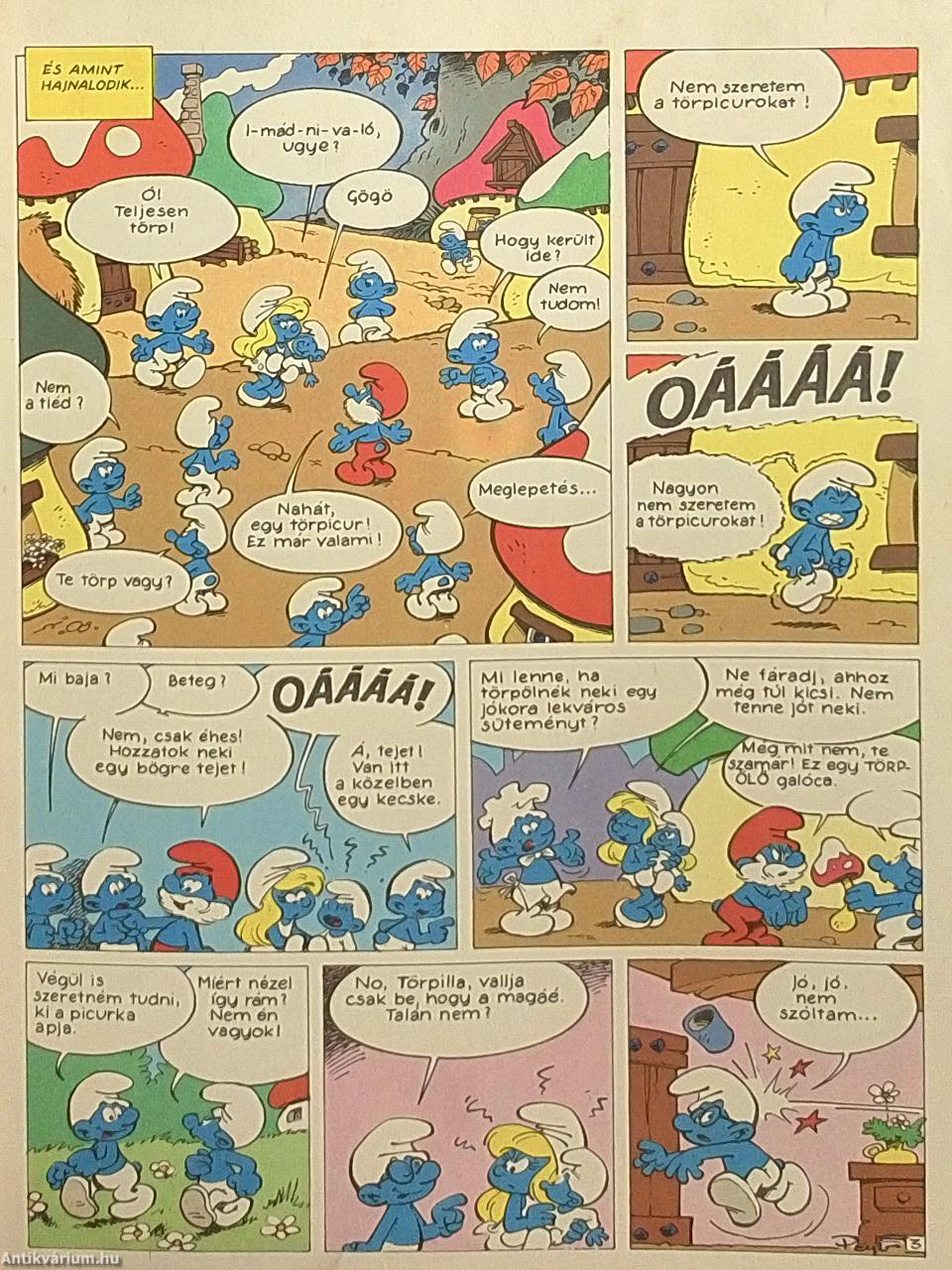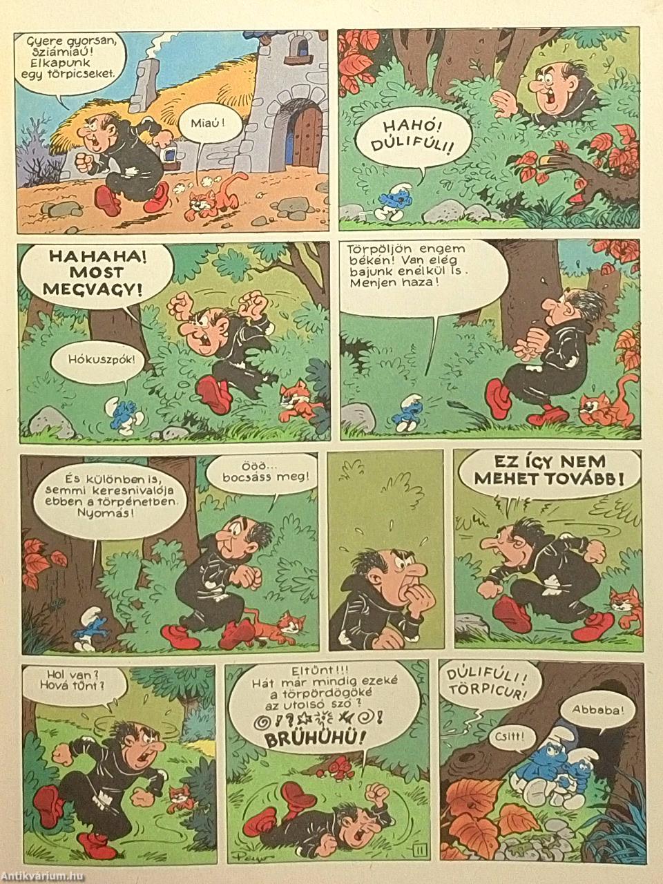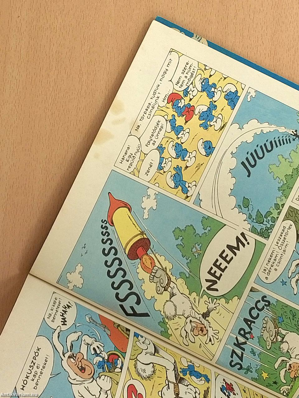 A színes képregény az ismert rajzfilmfigurák, a hupikék törpikék kalandjait tartalmazza.