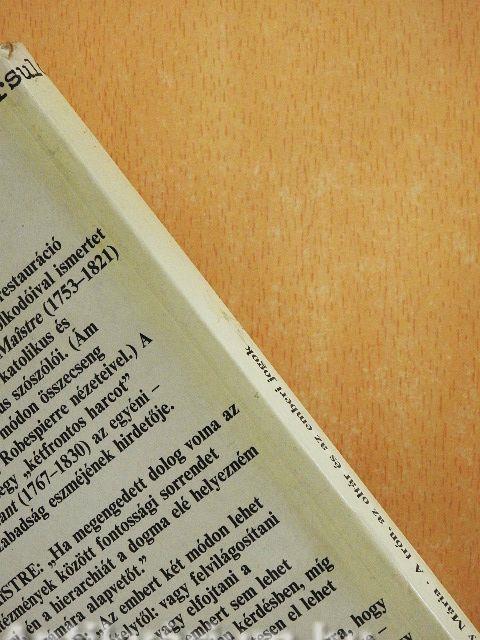 A Napóleon bukása utáni Bourbon-restauráció korának nevezetes politikai gondolkodóival ismertet meg bennünket ez a kötet. De Maistre (1753-1821) és De Bonald (1754-1840) a katolikus és királypárti konzervativizmus szószólói. (Ám véleményük néha furcsa módon összecseng Russeau, Saint-Just, Robespierre nézeteivel) A velük szemben mintegy "kétfrontos harcot" folytató B. Constant (1767-1830) az egyéni - magánéleti - szabadság eszméjének hirdetője.