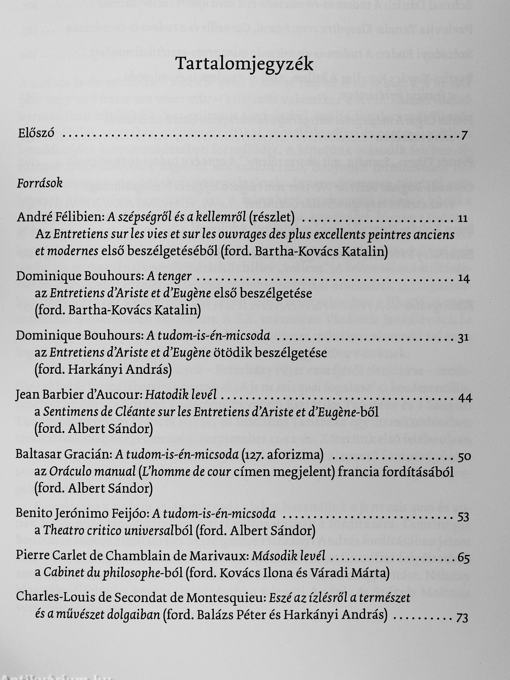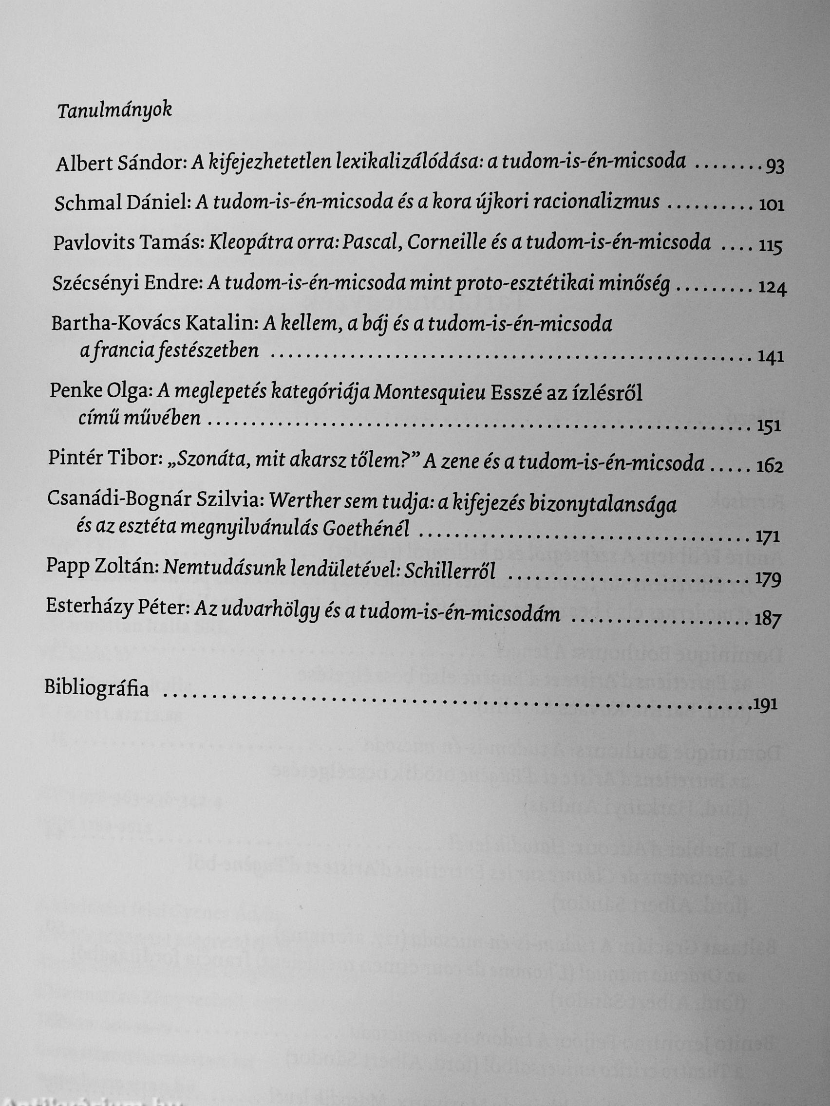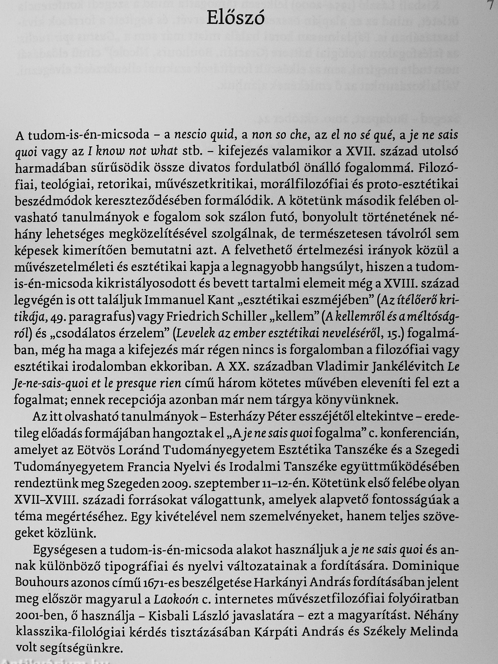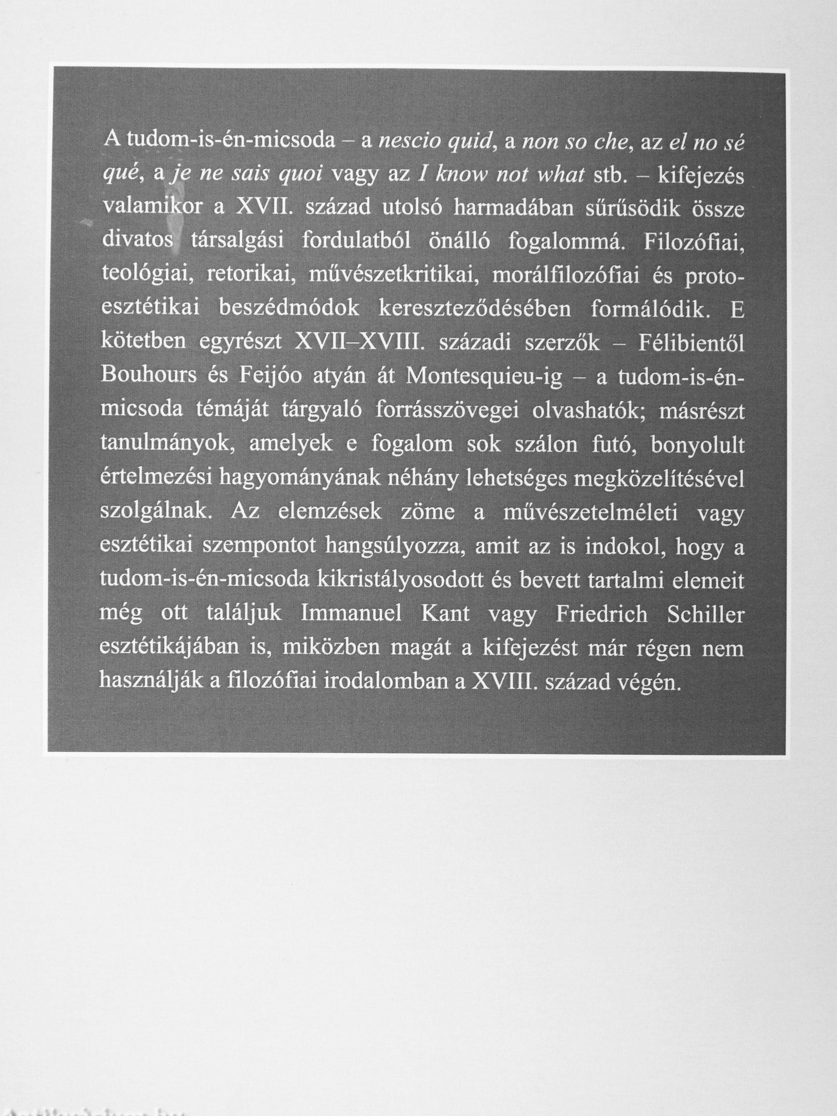 A tudom-is-én-micsoda - a nescio quid, a non so che, az el no sé qué, a/e ne sais quoi vagy az I know not what stb. - kifejezés valamftor a XVII. század utolsó harmadában sűrűsödik össze divato^ társalgási fordulatból önálló fogalommá. Filozófiai, teológiai, retorikai, művészetkritikai, morálfilozófiai és proto-esztétikai beszédmódok kereszteződésében formálódik. E kötetben egyrészt XVII-XVIII. századi szerzők - Félibientöl Bouhours és Feijóo atyán át Montesquieu-ig - a tudom-is-én-micsoda témáját tárgyaló forrásszövegei olvashatók; másrészt tanulmányok, amelyek e fogalom sok szálon futó, bonyolult értelmezési hagyományának néhány lehetséges megközelítésével szolgálnak. Az elemzések zöme a művészetelméleti vagy esztétikai szempontot hangsúlyozza, amit az is indokol, hogy a tudom-is-én-micsoda kikristályosodott és bevett tartahni elemeit még ott találjuk Immánuel Kant vagy Friedrich Schiller esztétikájában is, miközben magát a kifejezést már régen nem használják a filozófiai irodalomban a XVIII. század végén. Vissza