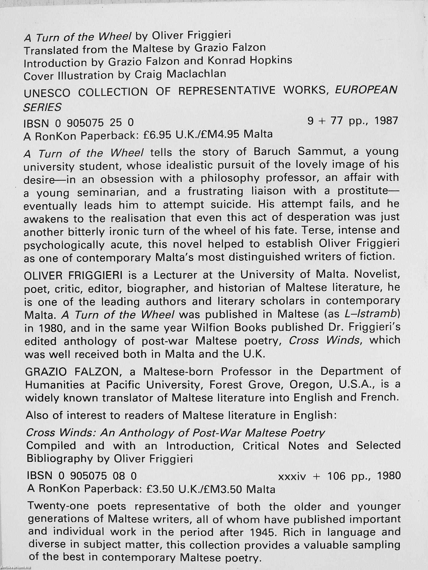 OLIVER FRIGGIERI is a Lecturer at the University of Malta. Novelist, poet, critic, editor, biographer, and historian of Maltese literature, he is one of the leading authors and literary scholars in contemporary Malta. A Turn of the Wheel was published in Maltese (as L-lstramb) in 1980, and in the same year Wilfion Books published Dr. Friggieri's edited anthology of post-war Maltese poetry. Cross Winds, which was well received both in Malta and the U.K.