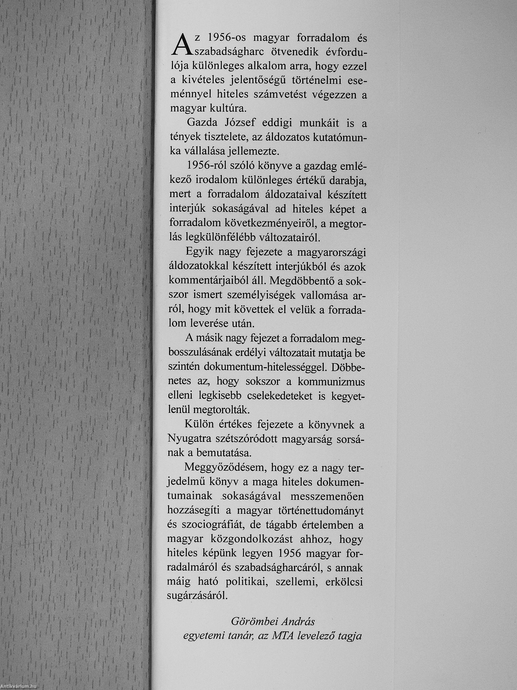 Meggyőződésem, hogy ez a nagy terjedelmű könyv a maga hiteles dokumentumainak sokaságával messzemenően hozzásegíti a magyar történettudományt és szociográfiát, de tágabb értelemben a magyar közgondolkozást ahhoz, hogy hiteles képünk legyen 1956 magyar forradalmáról és szabadságharcáról, s annak máig ható politikai, szellemi, erkölcsi sugárzásáról.