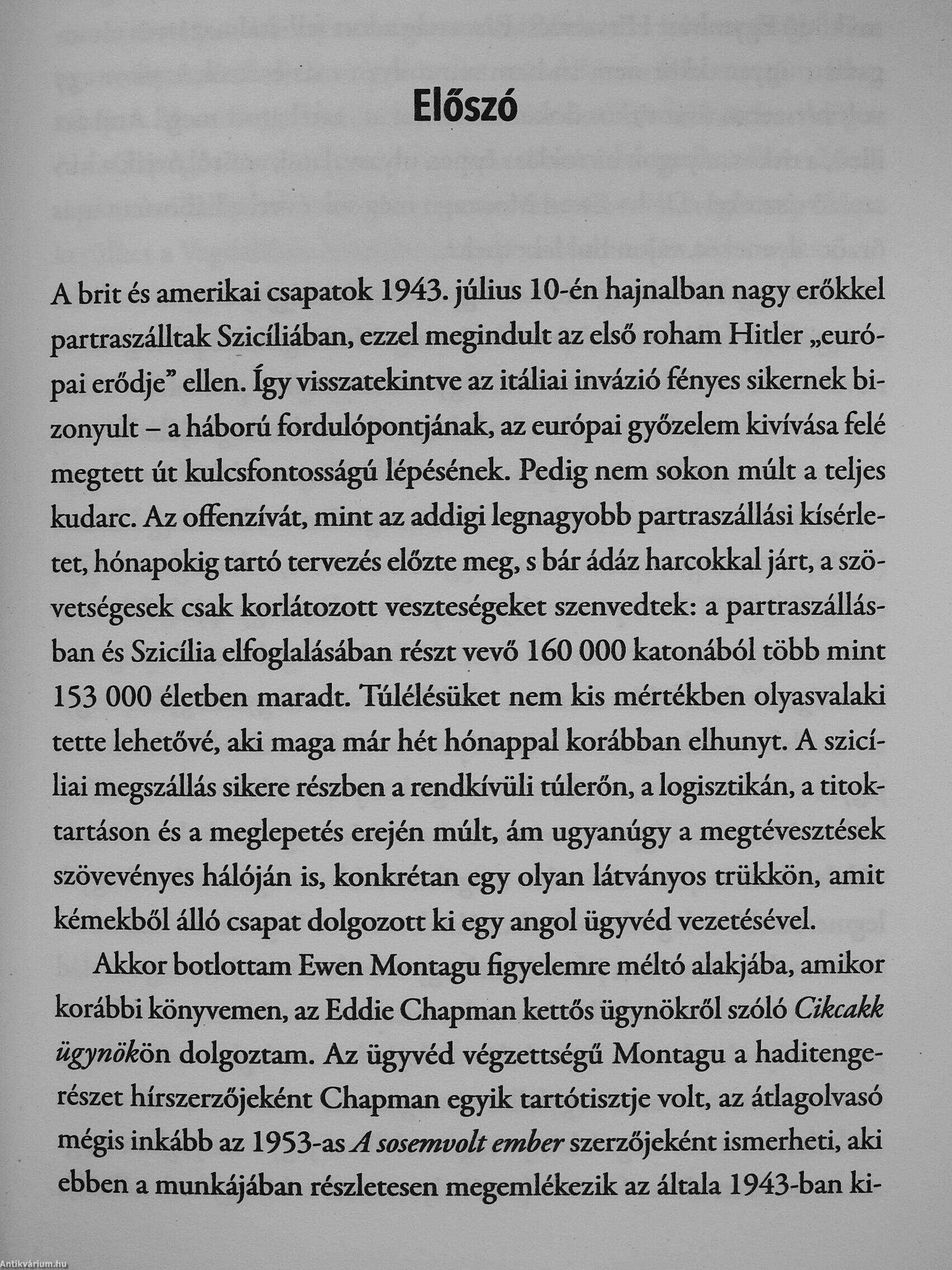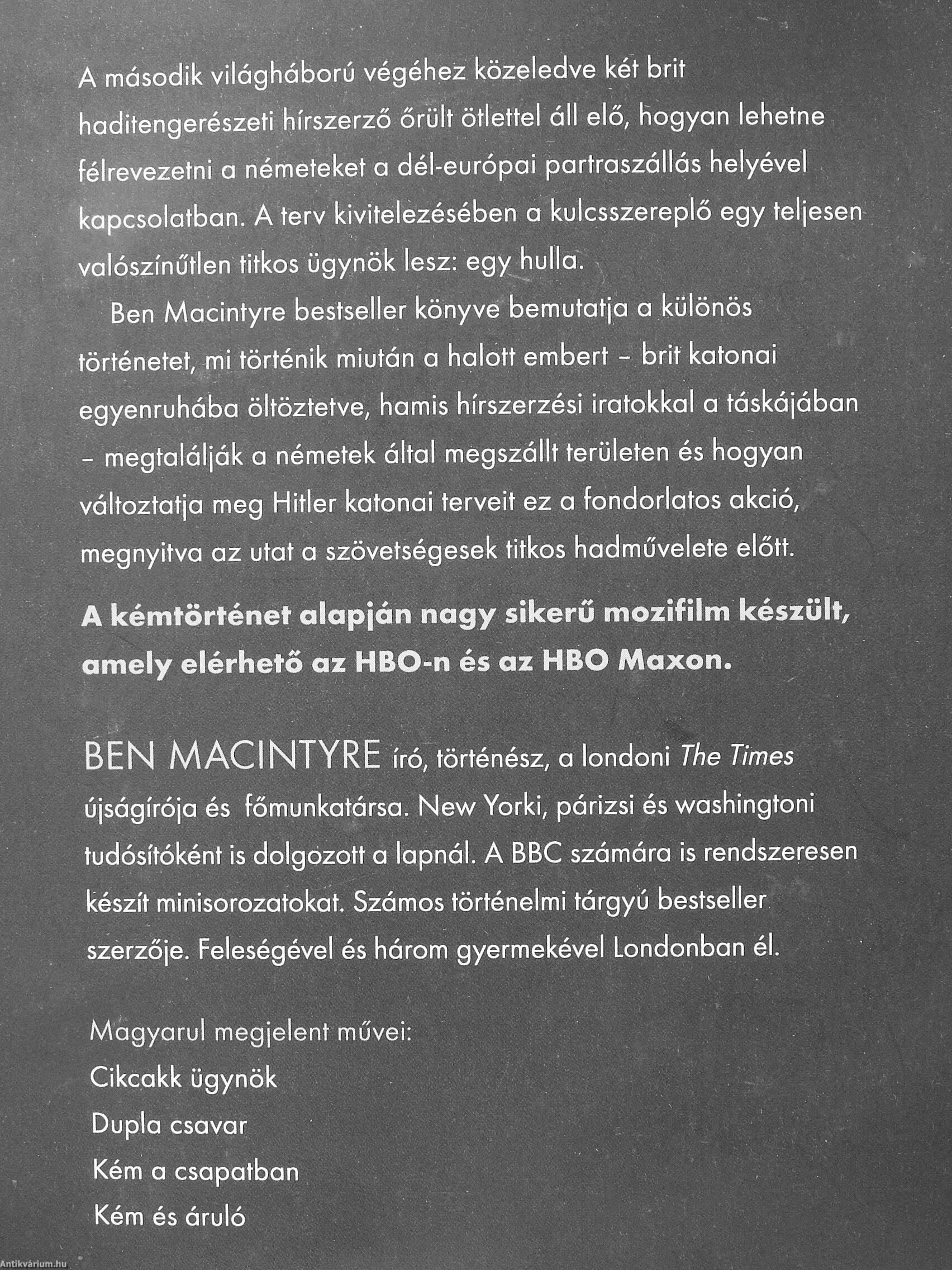Ben Macintyre bestseller könyve bemutatja a különös történetet, mi történik miután a halott embert - brit katonai egyenruhába öltöztetve, hamis hírszerzési iratokkal a táskájában - megtalálják a németek által megszállt területen és hogyan változtatja meg Hitler katonai terveit ez a fondorlatos akció, megnyitva az utat a szövetségesek titkos hadművelete előtt.