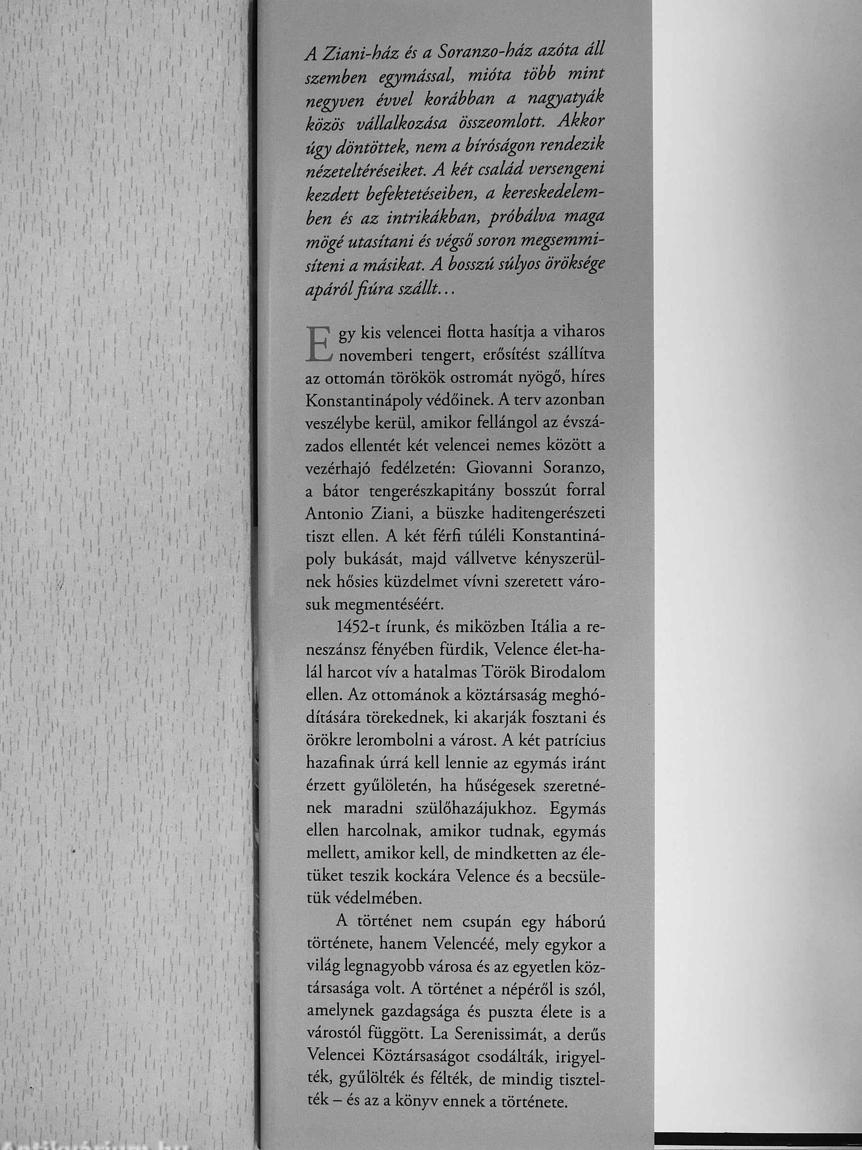 A történet nem csupán egy háború története, hanem Velencéé, mely egykor a világ legnagyobb városa és az egyetlen köztársasága volt. A történet a népéről is szól, amelynek gazdagsága és puszta élete is a várostól függött. La Serenissimát, a derűs Velencei Köztársaságot csodálták, irigyelték, gyűlölték és félték, de mindig tisztelték - és az a könyv ennek a története.