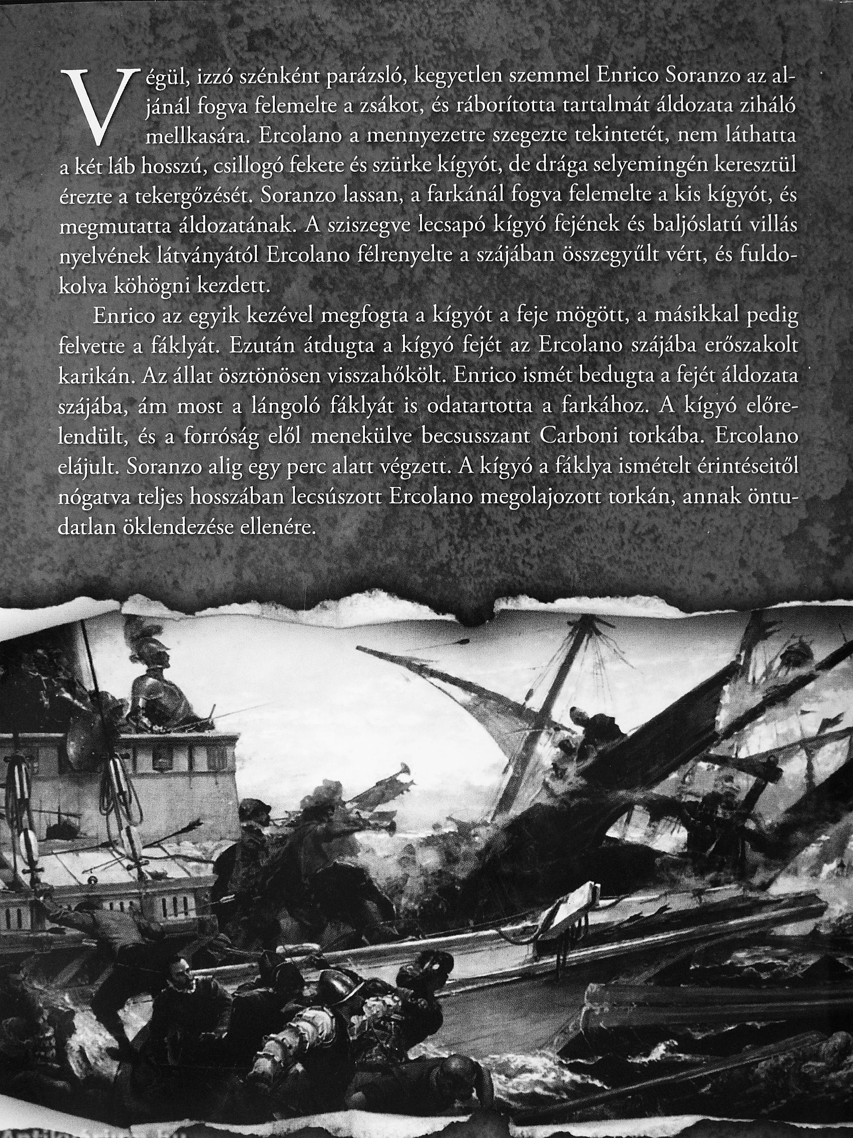 Végül, izzó szénként parázsló, kegyetlen szemmel Enrico Soranzo az aljánál fogva felemelte a zsákot, és ráborította tartalmát áldozata ziháló mellkasára. Ercolano a mennyezetre szegezte tekintetét, nem láthatta a két láb hosszú, csillogó fekete és szürke kígyót, de drága selyemingén keresztül érezte a tekergőzését. Soranzo lassan, a farkánál fogva felemelte a kis kígyót, és megmutatta áldozatának. A sziszegve lecsapó kígyó fejének és baljóslatti villás nyelvének látványától Ercolano félrenyelte a szájában összegyűlt vért, és fuldokolva köhögni kezdett.