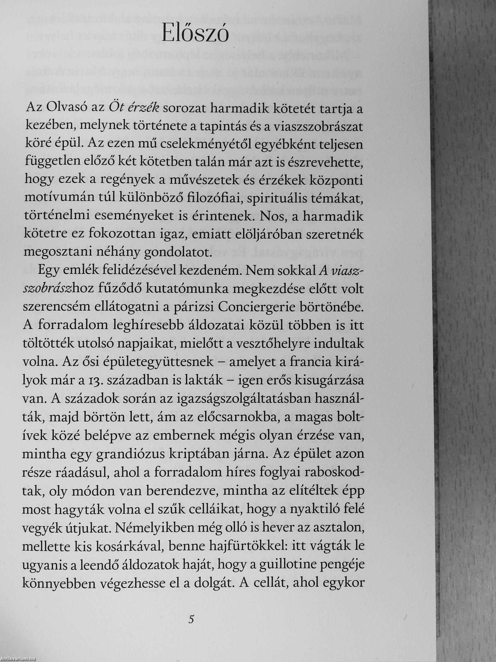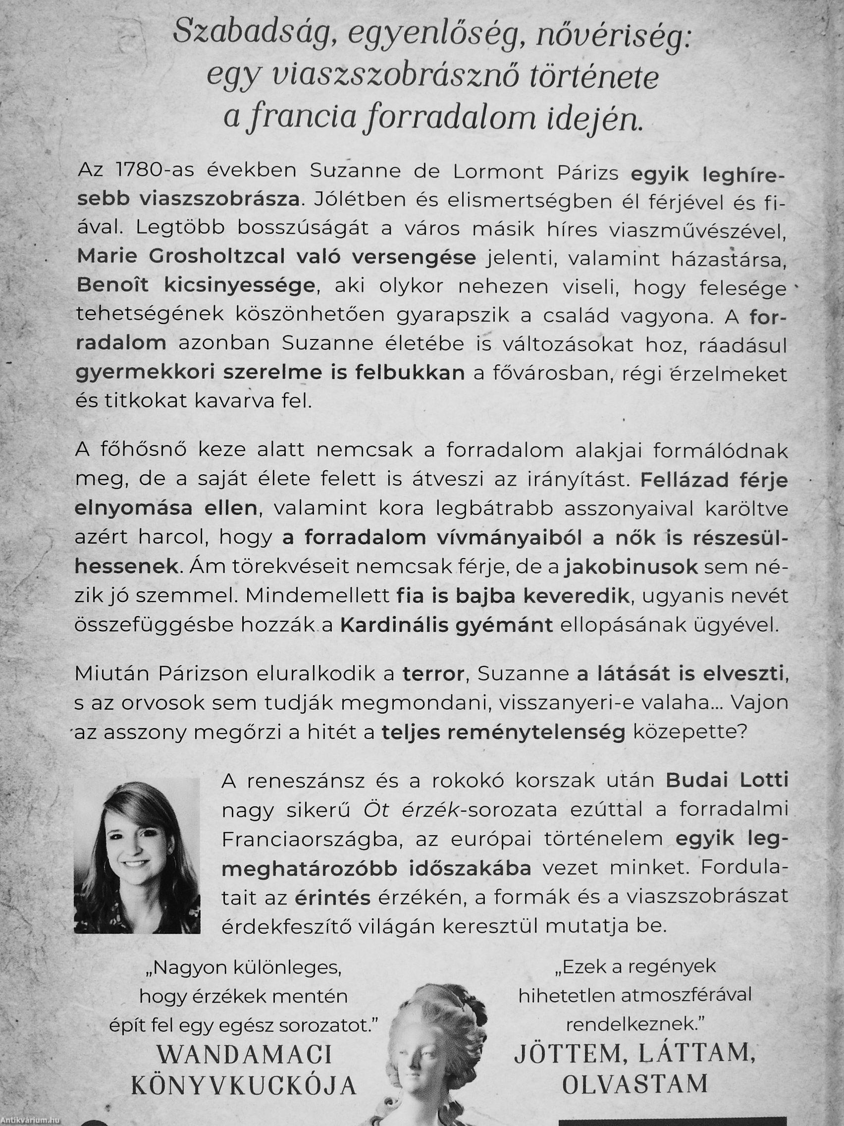 A reneszánsz és a rokokó korszak után Budai Lotti nagy sikerű Öt érzék-sorozata ezúttal a forradalmi Franciaországba, az európai történelem egyik legmeghatározóbb időszakába vezet minket. Fordulatait az érintés érzékén, a formák és a viaszszobrászat érdekfeszítő világán keresztül mutatja be.