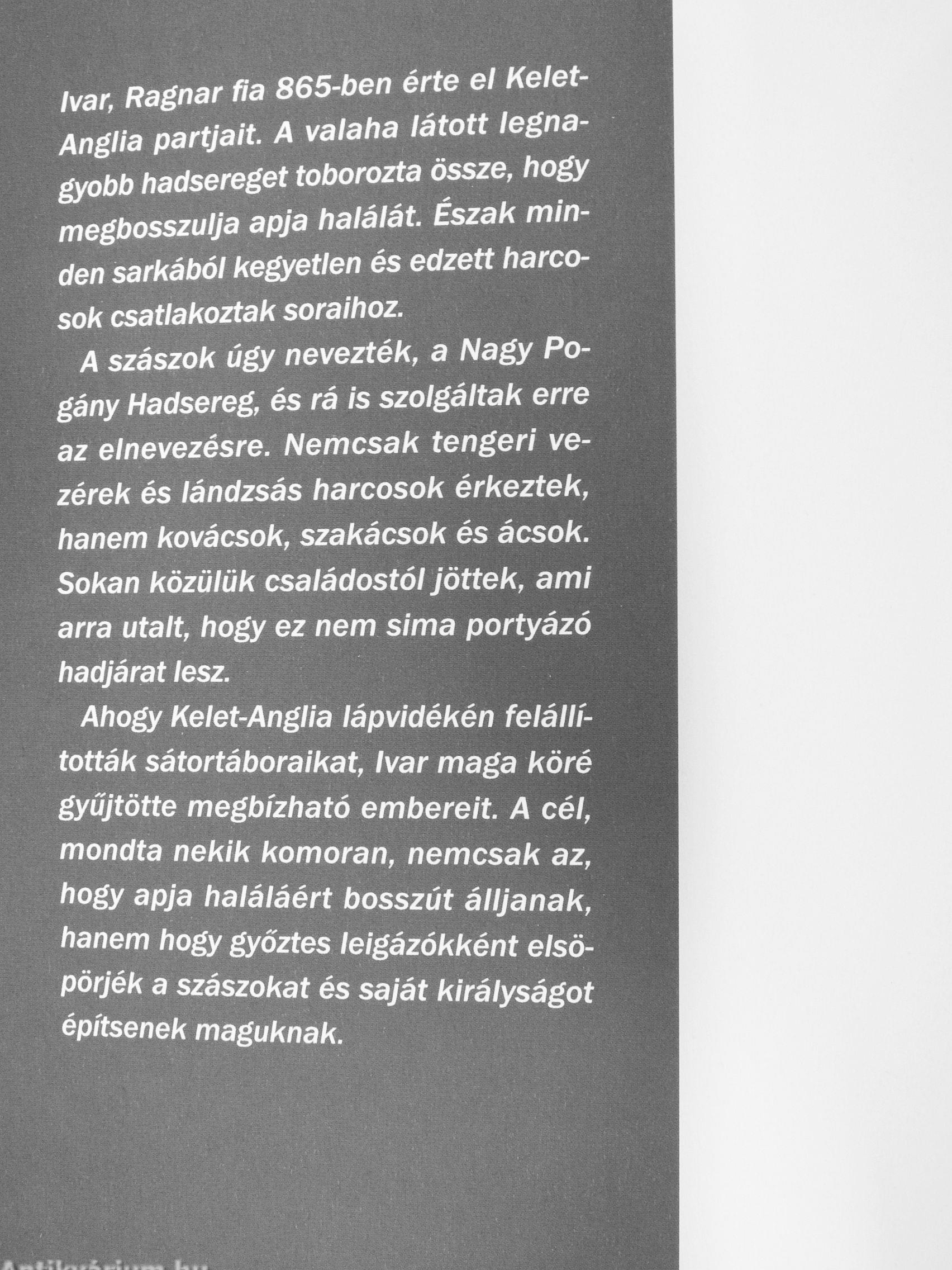 Ahogy Kelet-Anglia lápvidékén felállították sátortáboraikat. Ivar maga köré gyűjtötte megbízható embereit. A cél, mondta nekik komoran, nemcsak az, hogy apja haláláért bosszút álljanak, hanem hogy győztes leigázókként elsöpörjék a szászokat és saját királyságot építsenek maguknak.