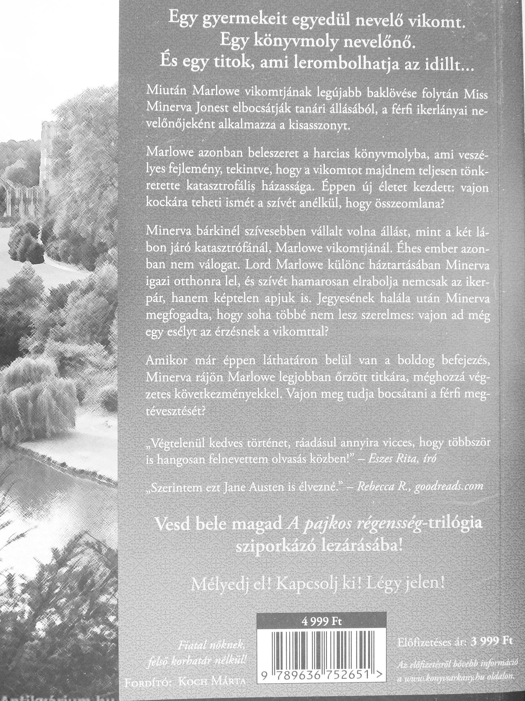 Minerva bárkinél szívesebben vállalt volna állást, mint a két lá-• bon járó katasztrófánál, Marlowe vikomtjánál. Éhes ember azonban nem válogat. Lord Marlowe különc háztartásában Minerva ~ igazi otthonra lel, és szívét hamarosan elrabolja nemcsak az iker- ^ pár, hanem képtelen apjuk is. Jegyesének halála után Minerva , - megfogadta, hogy soha többé nem lesz szerelmes: vajon ad még égy esélyt az érzésnek a vikomttal?