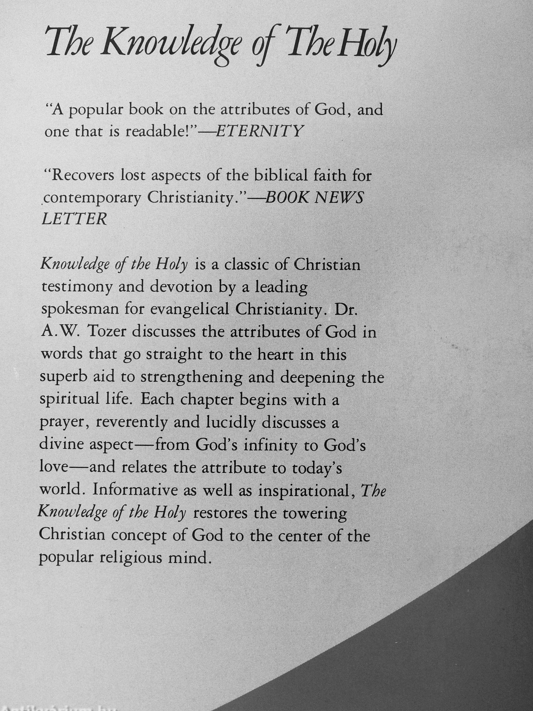 Knowledge of the Holy is a classic of Christian testimony and devotion by a leading spokesman for evangelical Christianity. Dr. A.W. Tozer discusses the attributes of God in words that go straight to the heart in this superb aid to strengthening and deepening the spiritual life. Each chapter begins with a prayer, reverently and lucidly discusses a divine aspect—from God's infinity to God's love—and relates the attribute to today's world. Informative as well as inspirational, The Knowledge of the Holy restores the towering Christian concept of God to the center of the popular religious mind.