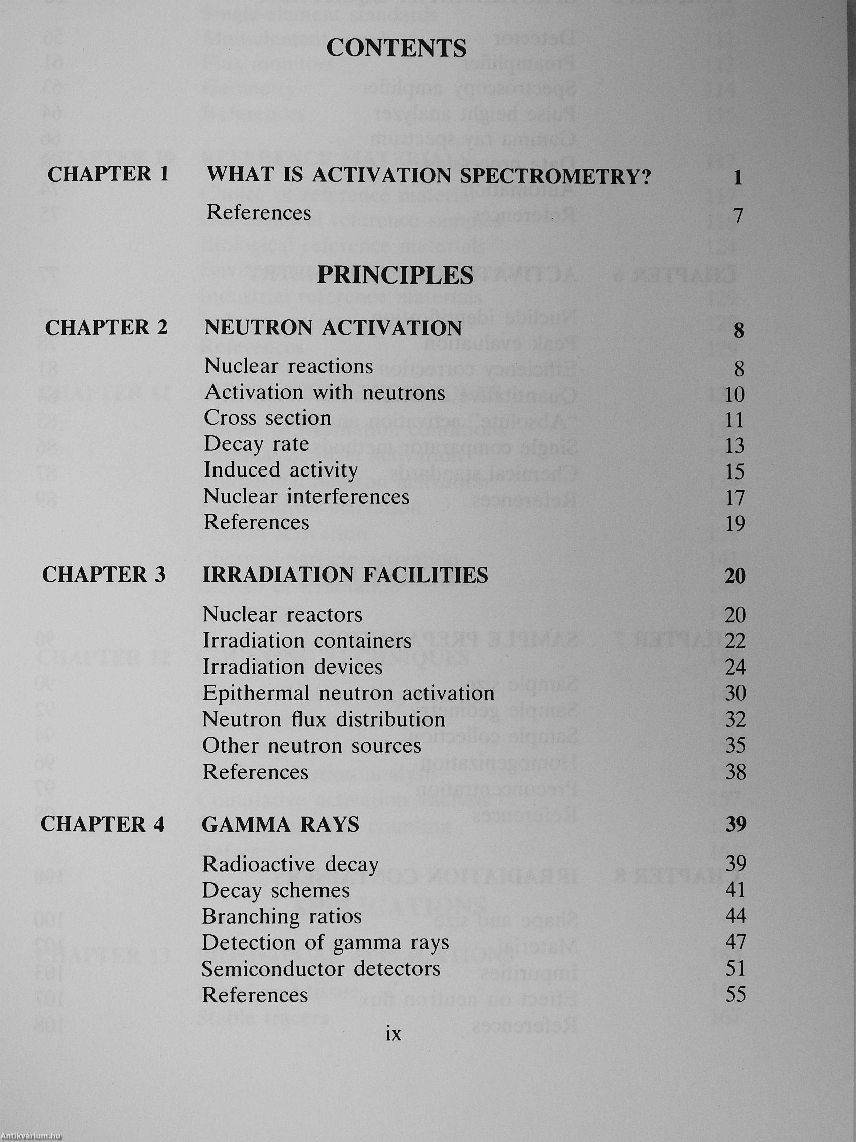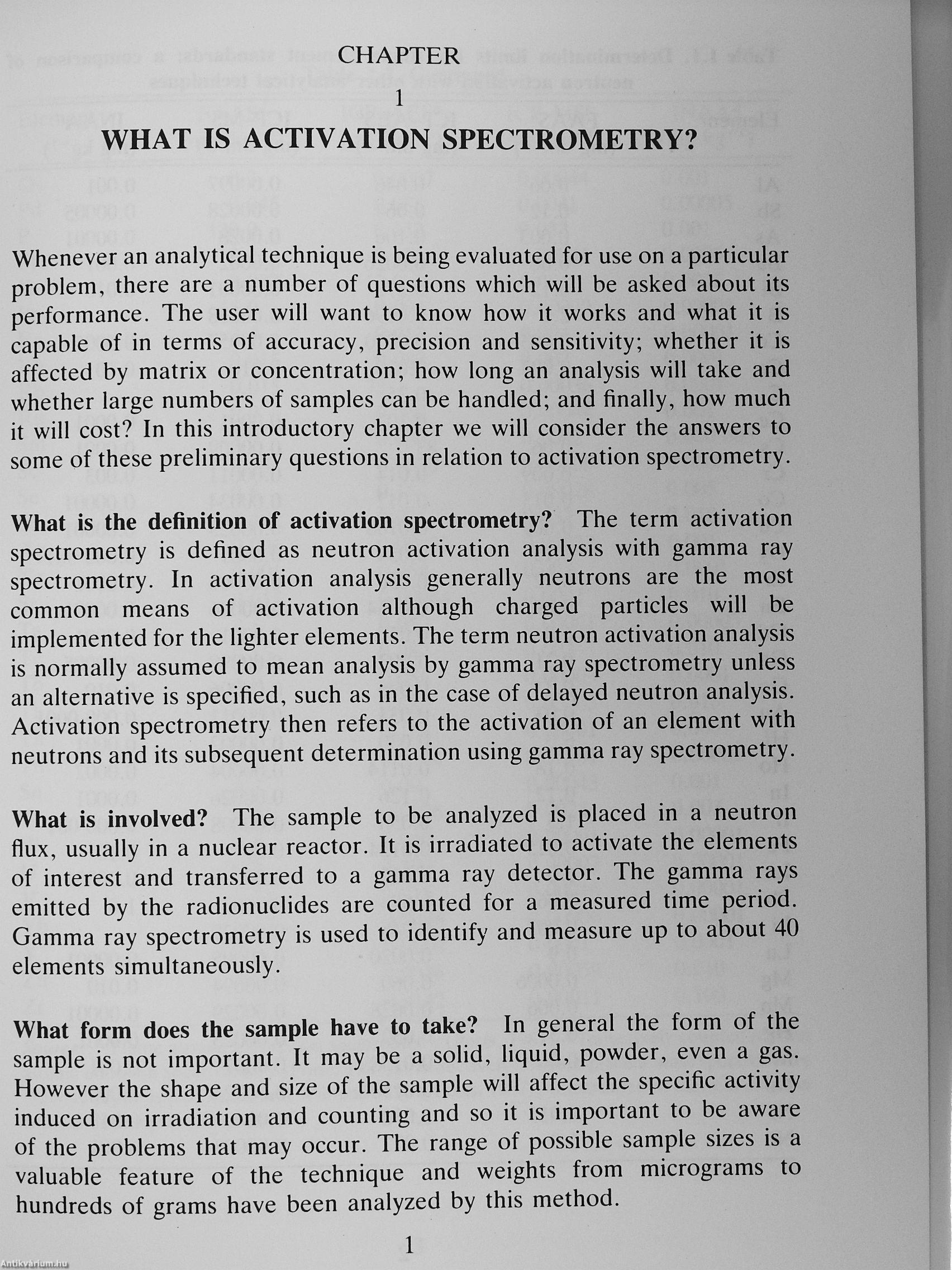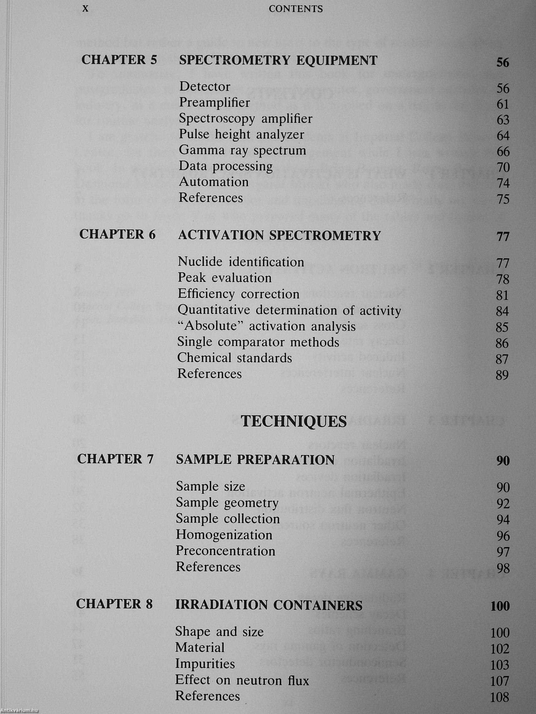 The book describes the current status of activation spectrometry in a concise, three-part format: principles, techniques, and applications. Chapter 1 gives a brief overview of the capabilities of the method, relating it to other multi-elemental analytical techniques. Chapters 2 to 6 describe, without need of detailed physics, the principles of neutron activation and gamma ray spectrometry Chapters 7 to 10, written for those interested in the technique itself, describe methods for sampling and preparing the material, creating standards, and choosing reference materials. Chapters tl and 12 describe the irradiation and counting procedures com-