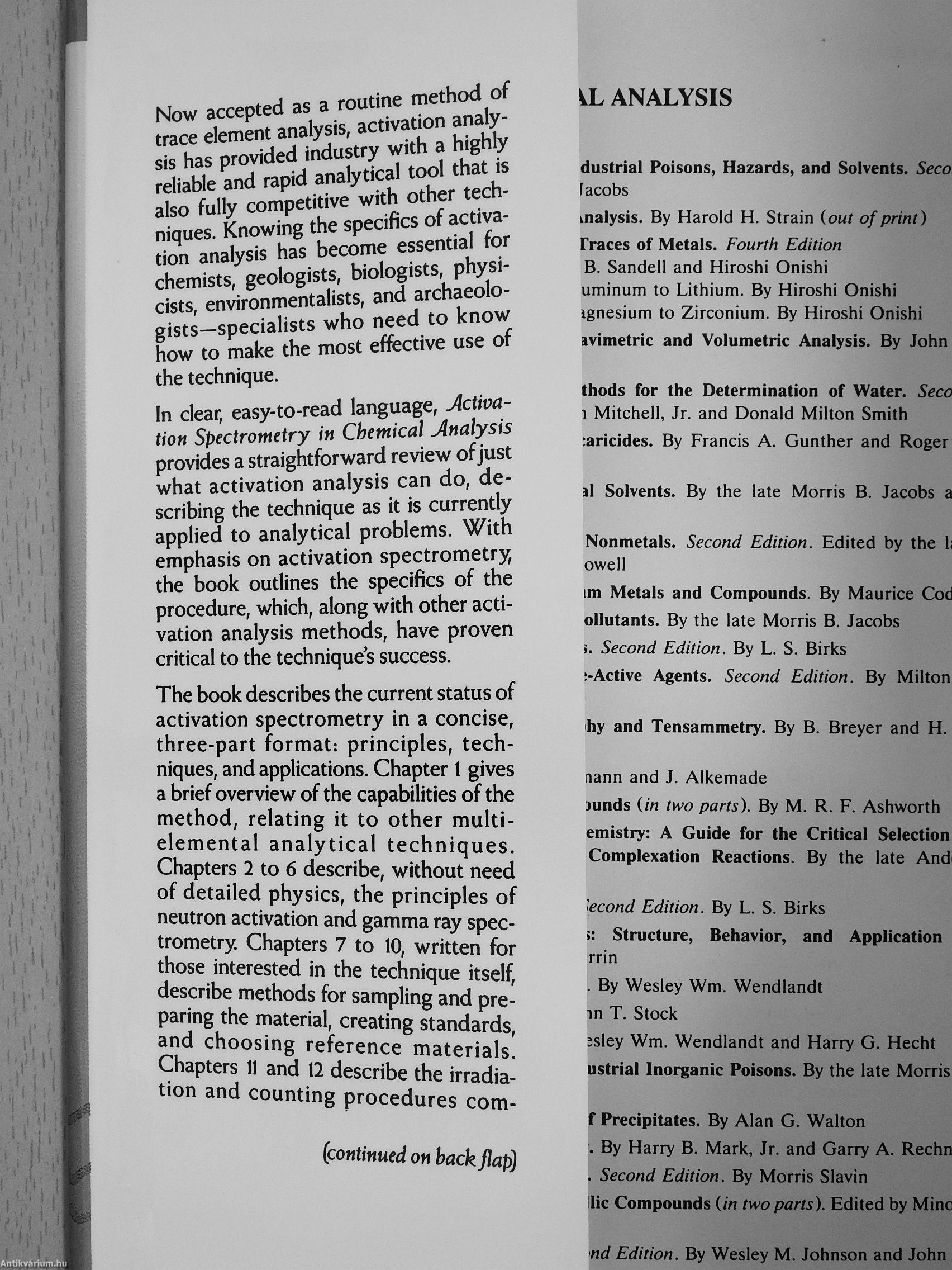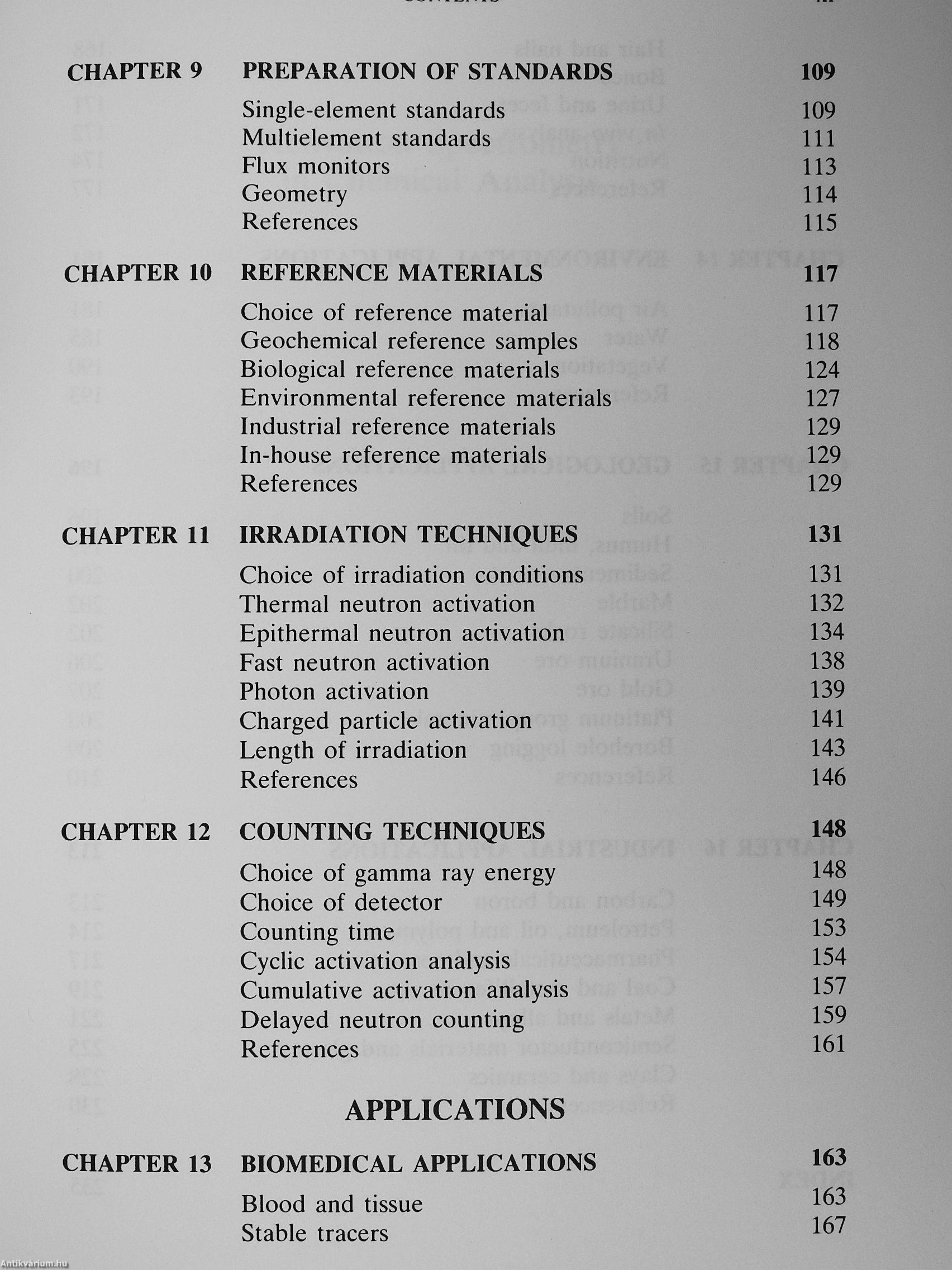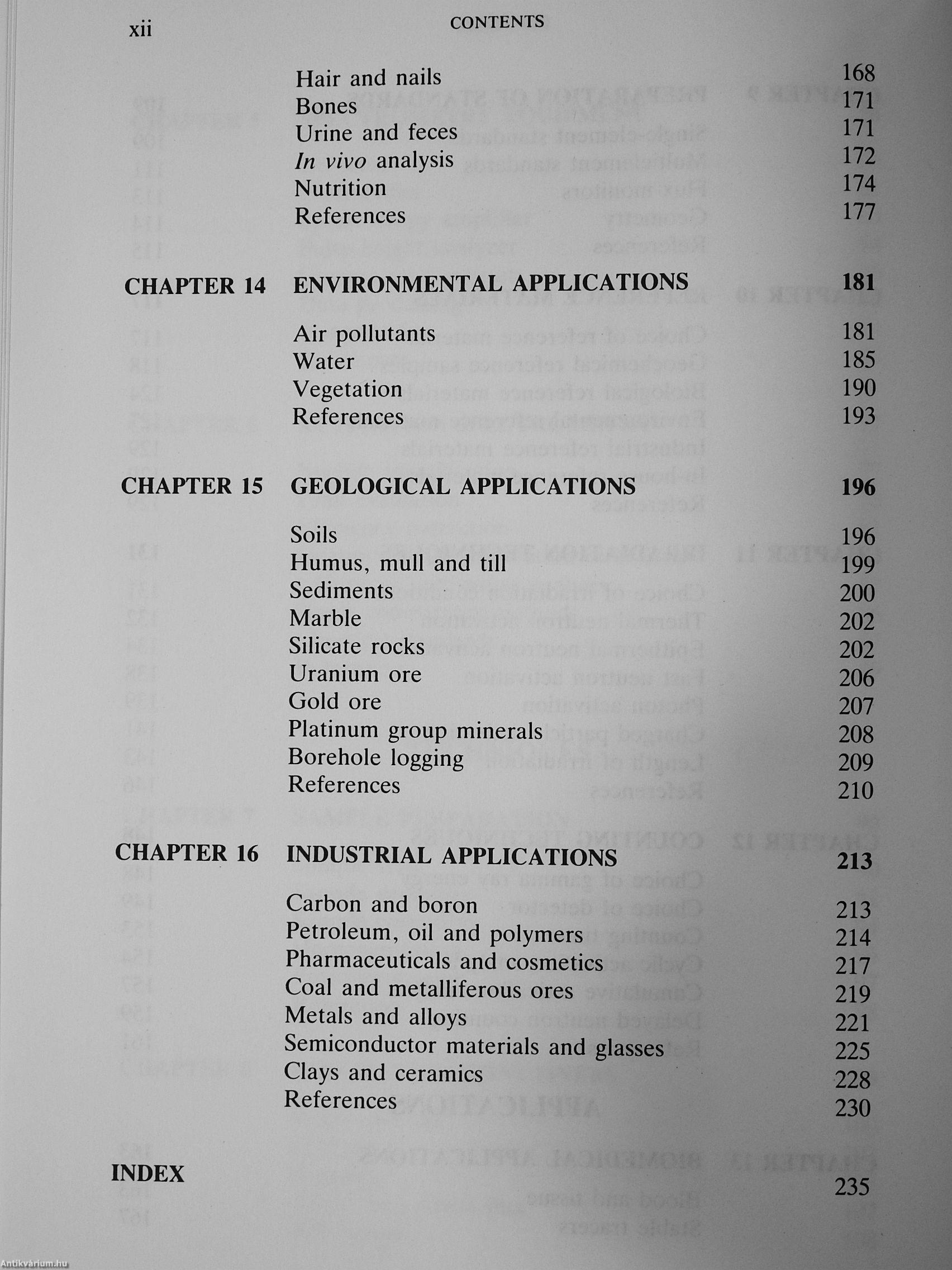 The book describes the current status of activation spectrometry in a concise, three-part format: principles, techniques, and applications. Chapter 1 gives a brief overview of the capabilities of the method, relating it to other multi-elemental analytical techniques. Chapters 2 to 6 describe, without need of detailed physics, the principles of neutron activation and gamma ray spectrometry Chapters 7 to 10, written for those interested in the technique itself, describe methods for sampling and preparing the material, creating standards, and choosing reference materials. Chapters tl and 12 describe the irradiation and counting procedures com-
