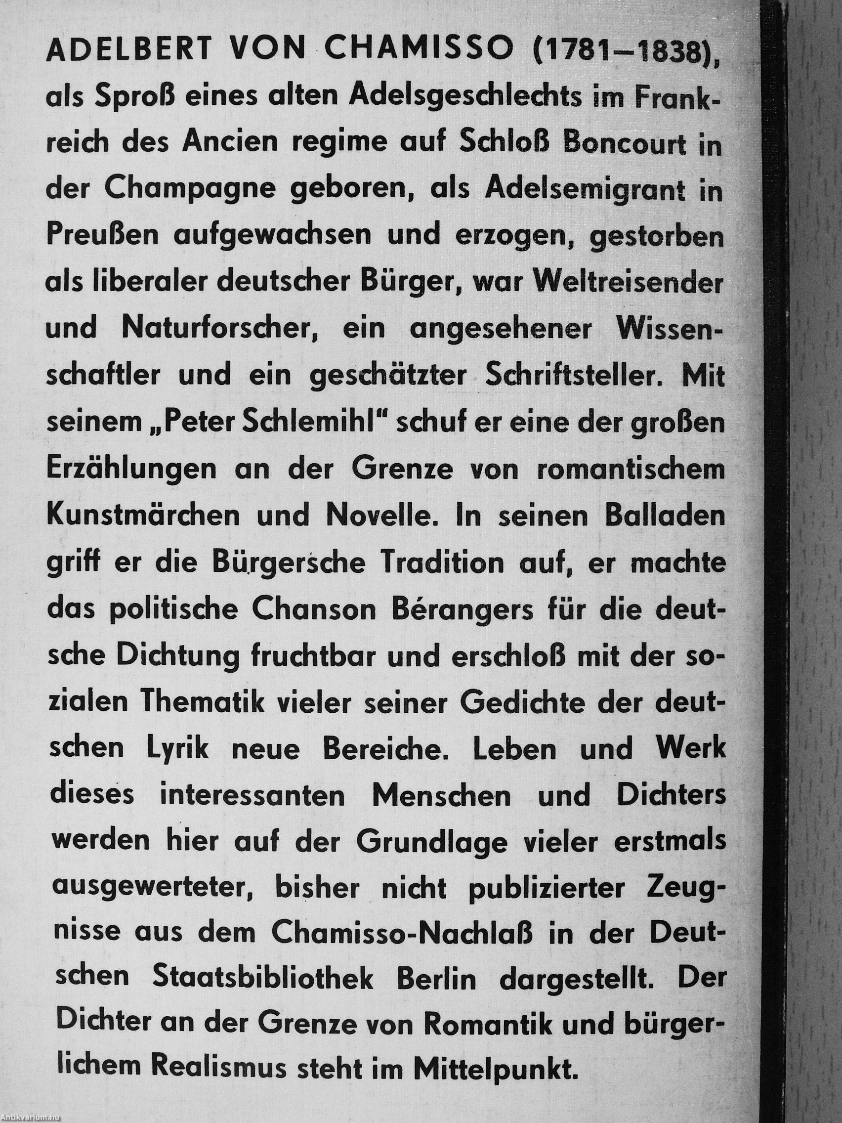 ADELBERT VON CHAMISSO (1781-1838), als Sproß eines alten Adelsgeschlechts im Frankreich des Ancien regime auf Schloß Boncourt in der Champagne geboren, als Adelsemigrant in Preußen aufgewachsen und erzogen, gestorben als liberaler deutscher Bürger, war Weltreisender und Naturforscher, ein angesehener Wissenschaftler und ein geschätzter Schriftsteller. Mit seinem „Peter Schlemihl" schuf er eine der großen Erzählungen an der Grenze von romantischem Kunstmärchen und Novelle. In seinen Balladen griff er die Bürgersche Tradition auf, er machte das politische Chanson Berangers für die deutsche Dichtung fruchtbar und erschloß mit der sozialen Thematik vieler seiner Gedichte der deutschen Lyrik neue Bereiche. Leben und Werk dieses interessanten Menschen und Dichters werden hier auf der Grundlage vieler erstmals ausgewerteter, bisher nicht publizierter Zeugnisse aus dem Chamisso-Nachlaß in der Deutschen Staatsbibliothek Berlin dargestellt. Der Dichter an der Grenze von Romantik und bürgerlichem Realismus steht im Mittelpunkt. Vissza