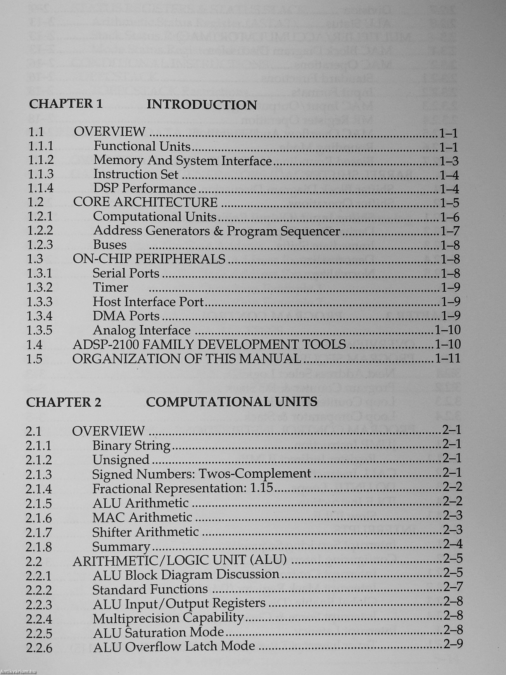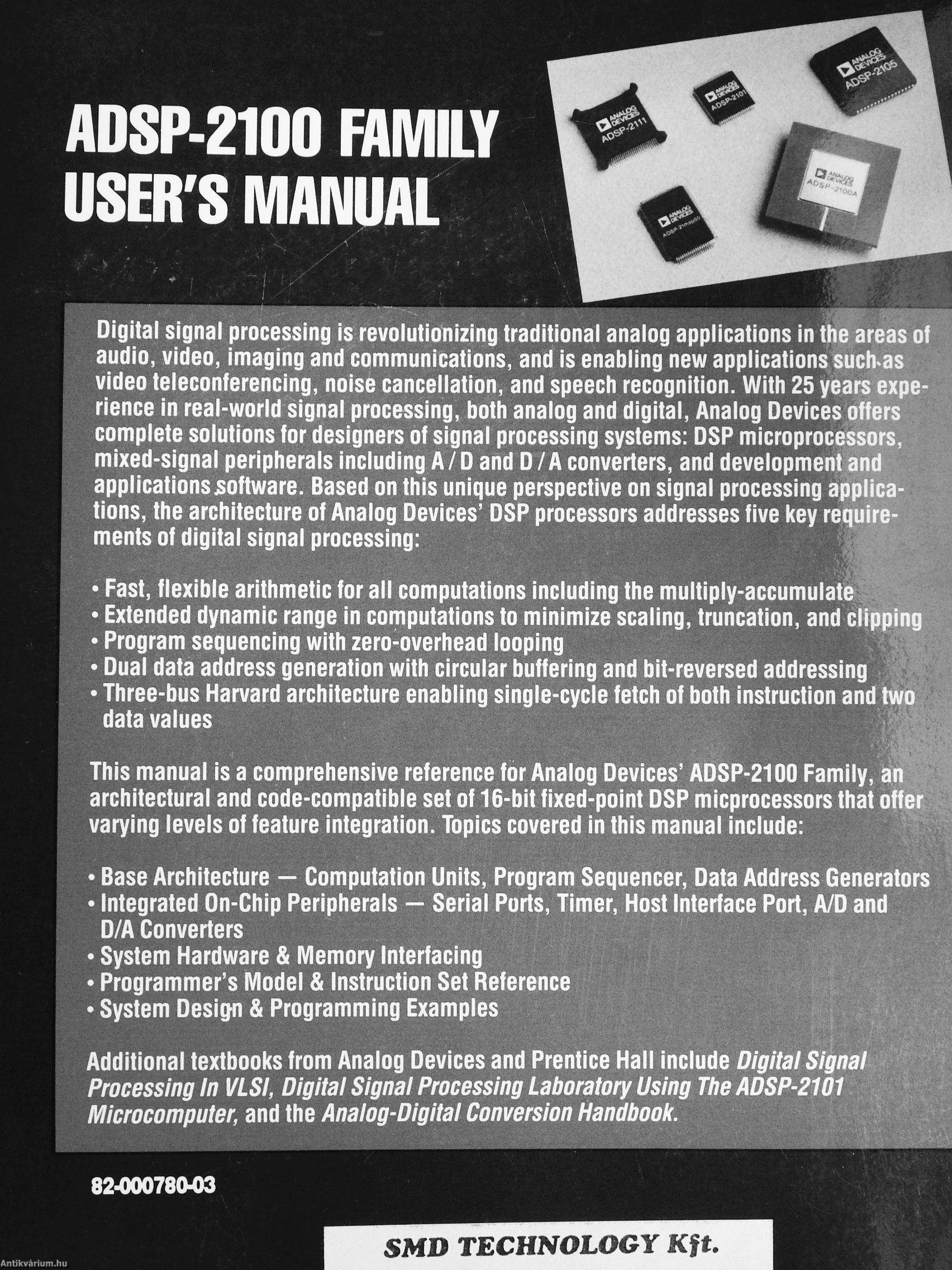 This manual Is a comprehensive reference fór Analog Devices' ADSP-2100 Family _ architectural and code-compatible set of 16-bit fixed-point DSP micprocessors that offec varying levels of feature integration. Topics covered |n this manual include: