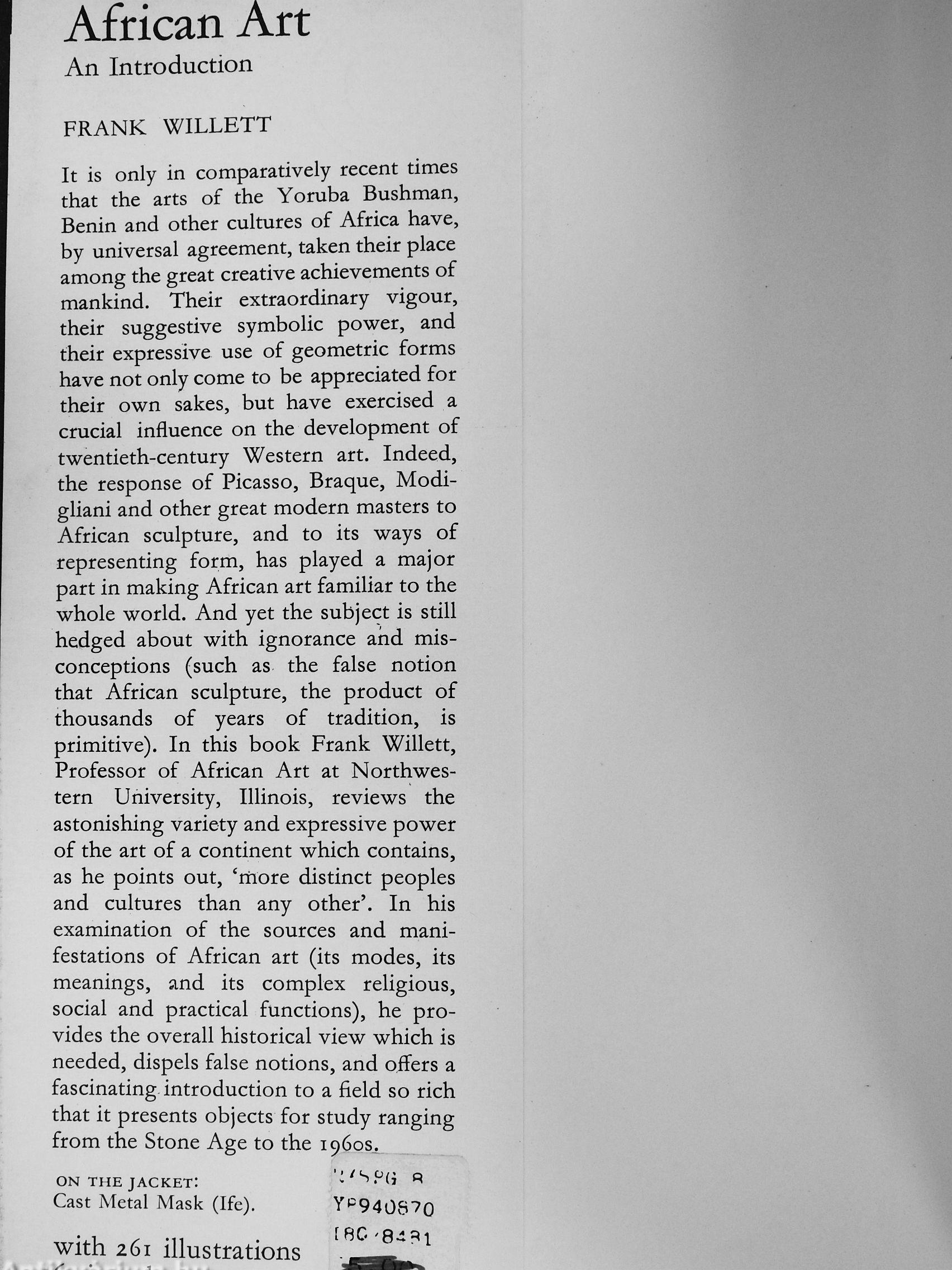 It is only in comparatively recent times that the arts of the Yoruba Bushman, Benin and other cultures of Africa have, by universal agreement, taken their place among the great creative achievements of mankind. Their extraordinary vigour, their suggestive symbolic power, and their expressive use of geometric forms have not only come to be appreciated for their own sakes, but have exercised a crucial influence on the development of twentieth-century Western art. Indeed, the response of Picasso, Braque, Modigliani and other great modern masters to African sculpture, and to its ways of representing form, has played a major part in making African art familiar to the whole world. And yet the subject is still hedged about with ignorance and misconceptions (such as the false notion that African sculpture, the product of thousands of years of tradition, is primitive). In this book Frank Willett, Professor of African Art at Northwestern University, Illinois, reviews the astonishing variety and expressive power of the art of a continent which contains, as he points out, 'more distinct peoples and cultures than any other'. In his examination of the sources and manifestations of African art (its modes, its meanings, and its complex religious, social and practical functions), he provides the overall historical view which is needed, dispels false notions, and offers a fascinating introduction to a field so rich that it presents objects for study ranging from the Stone Age to the i96os^