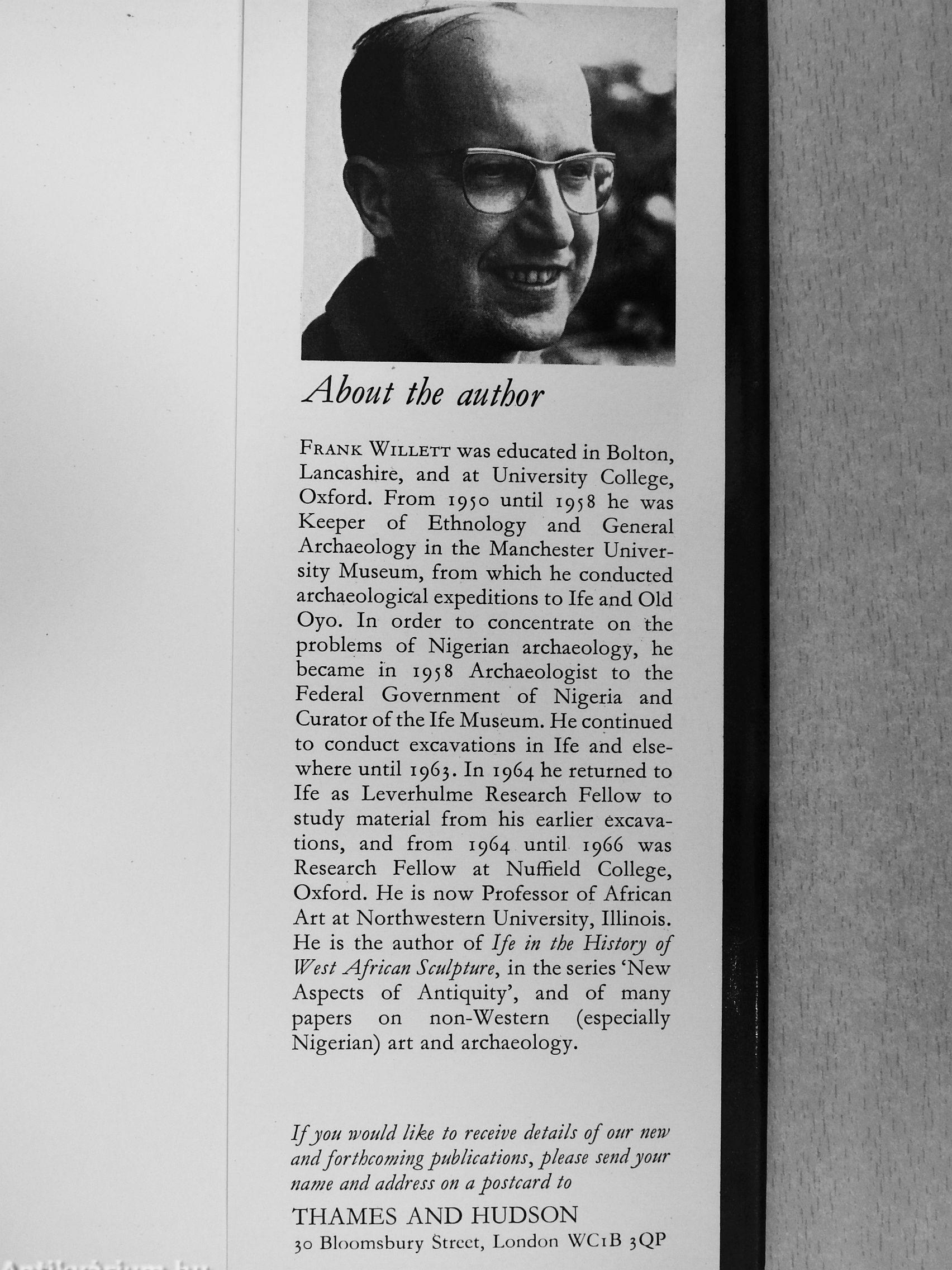 Frank Willett was educated in Bolton, Lancashire, and at University College, Oxford. From 1950 until 1958 he was Keeper of Ethnology and General Archaeology in the Manchester University Museum, from which he conducted archaeological expeditions to Ife and Old Oyo. In order to concentrate on the problems of Nigerian archaeology, he became in 1958 Archaeologist to the Federal Government of Nigeria and Curator of the Ife Museum. He continued to conduct excavations in Ife and elsewhere until 1963. In 1964 he returned to Ife as Leverhulme Research Fellow to study material from his earlier excavations, and from 1964 until 1966 was Research Fellow at Nuffield College, Oxford. He is now Professor of African Art at Northwestern University, Illinois. He is the author of Ife in the History of West African Sculpture, in the series 'New Aspects of Antiquity', and of many papers on non-Western (especially Nigerian) art and archaeology.