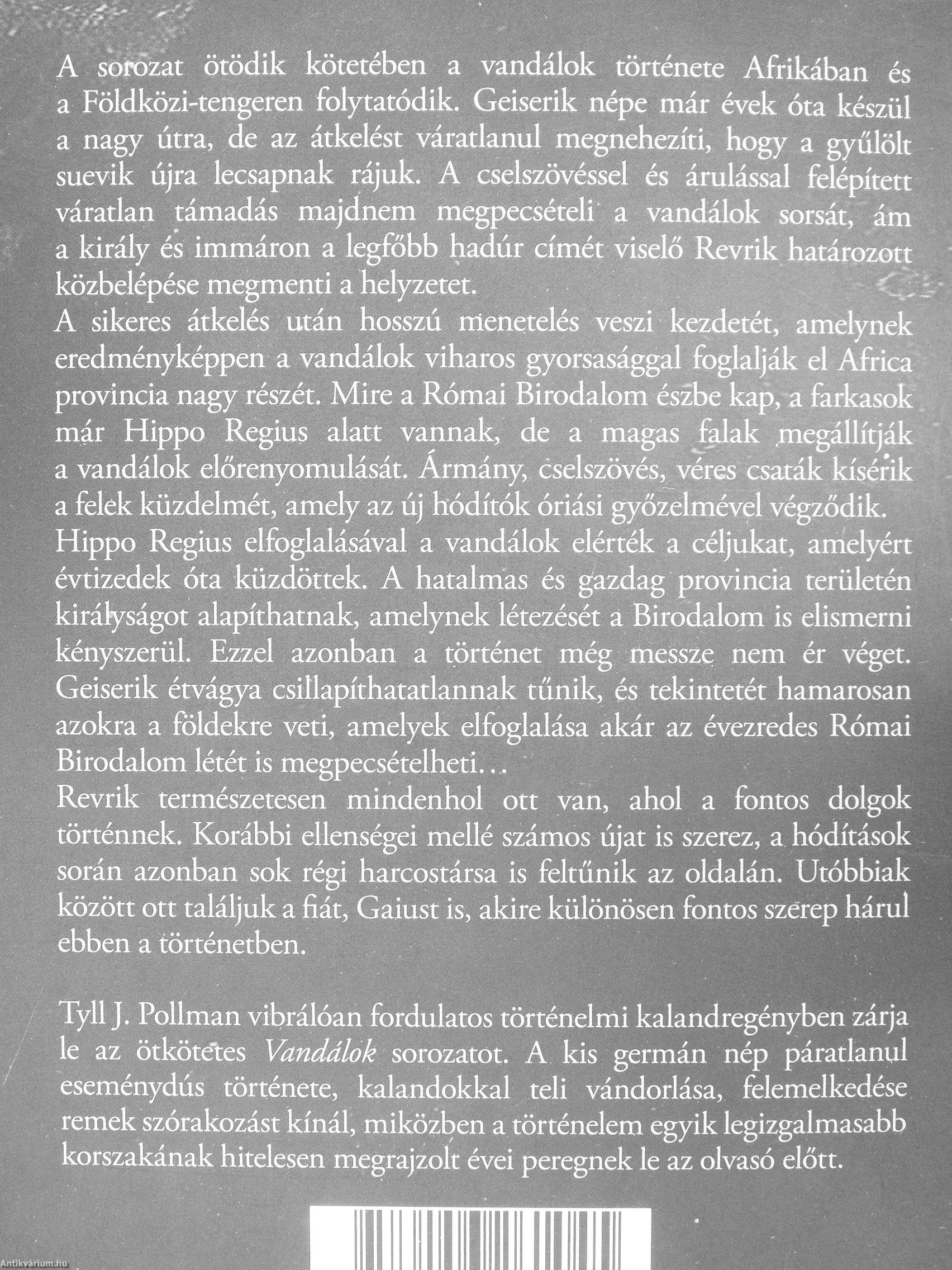 Tyll J. Pollman vibrálóan fordulatos történelmi kalandregényben zárja le az ötköte'tes Vandálok sorozatot. A kis germán nép páratlanul eseménydús története, kalandokkal teli vándorlása, felemelkedése remek szórakozást kínál, miközben a történelem egyik legizgalmasabb korszakának hitelesen megrajzolt évei peregnek le az olvasó előtt. Vissza