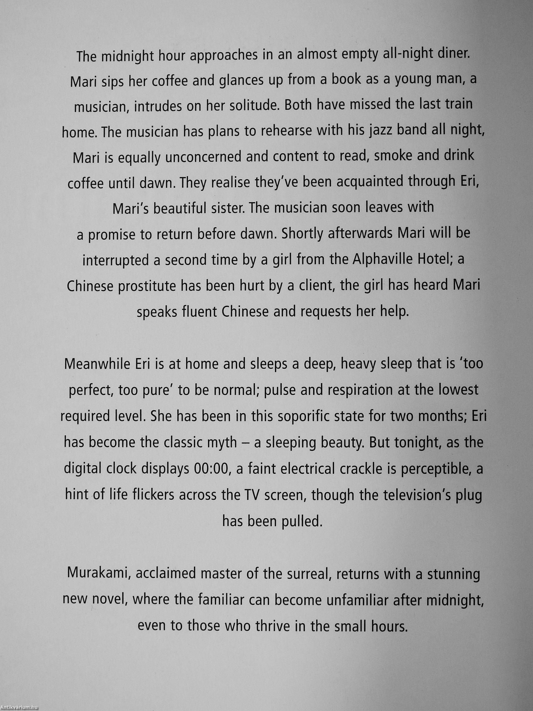 Murakami, acclaimed master of the surreal, returns with a stunning new novel, where the familiar can become unfamiliar after midnight, even to those who thrive in the small hours.