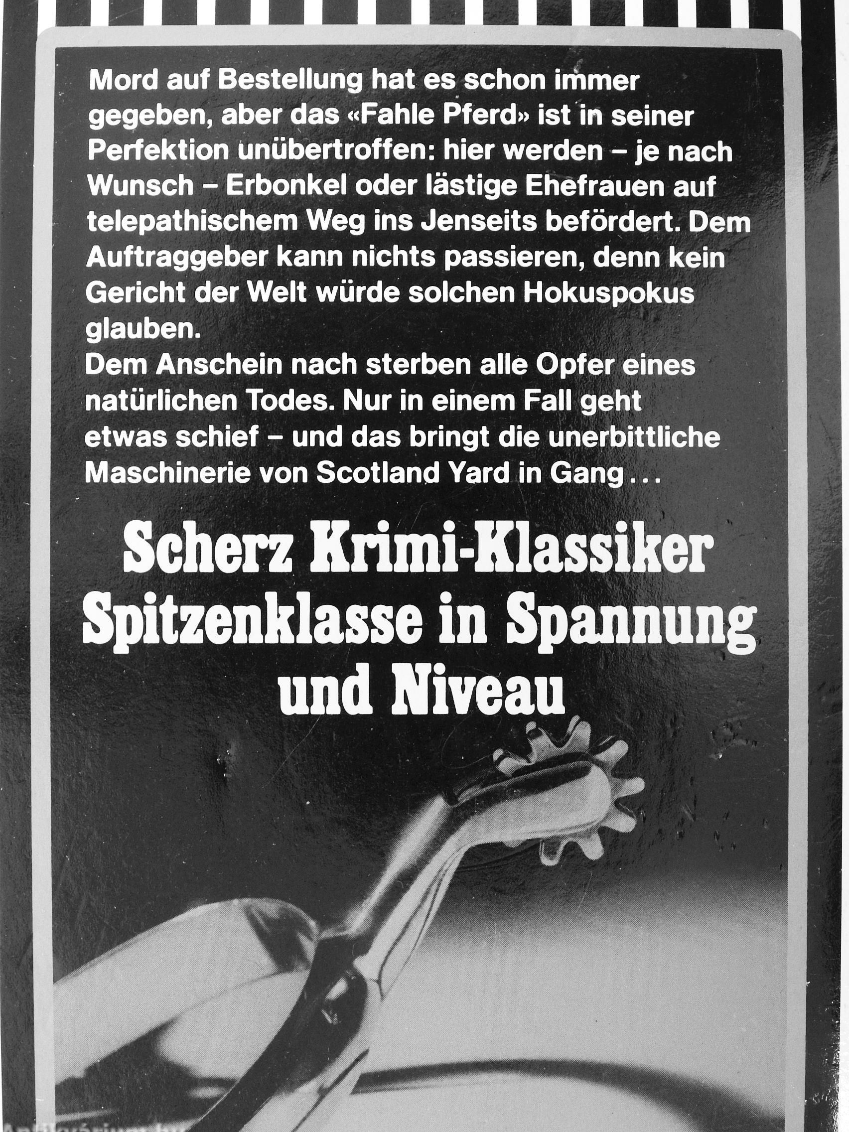 Mord auf Bestellung hat es schon iifimer gegeben, aber das «Fahle Pferd» ist in seiner Perfektion Unübertroffen: hier werden - je nach Wunsch - Erbonkel oder lästige Ehefrauen auf telepathischem Weg ins Jenseits befördert. Dem Auftraggeber kann nichts passieren, denn kein Gericht der Welt würde solchen Hokuspokus glauben.