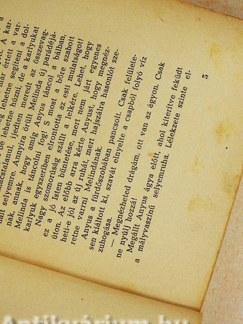 A felszabdalás még csak ment, de amikor a ruhát össze kellett állítania, zavarba jött. A karlyukat túl bőre szabta s annyit már értett a varráshoz, hogy fordítva még lehetne segíteni a dolgon, a ruha ujját be lehetne húzni, de a karlyukat nem. Tanácstalanul, ijedten meredt az összevagdalt selyemre. Annyira örült Melinda új parádéjának, annak, hogy amíg Anyus táncol a bálban, Melinda is táncolni fog! S most bőre szabott karlyuk egyszeriben elrontotta az esti mulatságot! S most a bőre szabott karlyuk egyszeriben elrontotta az esti mulatságot!"