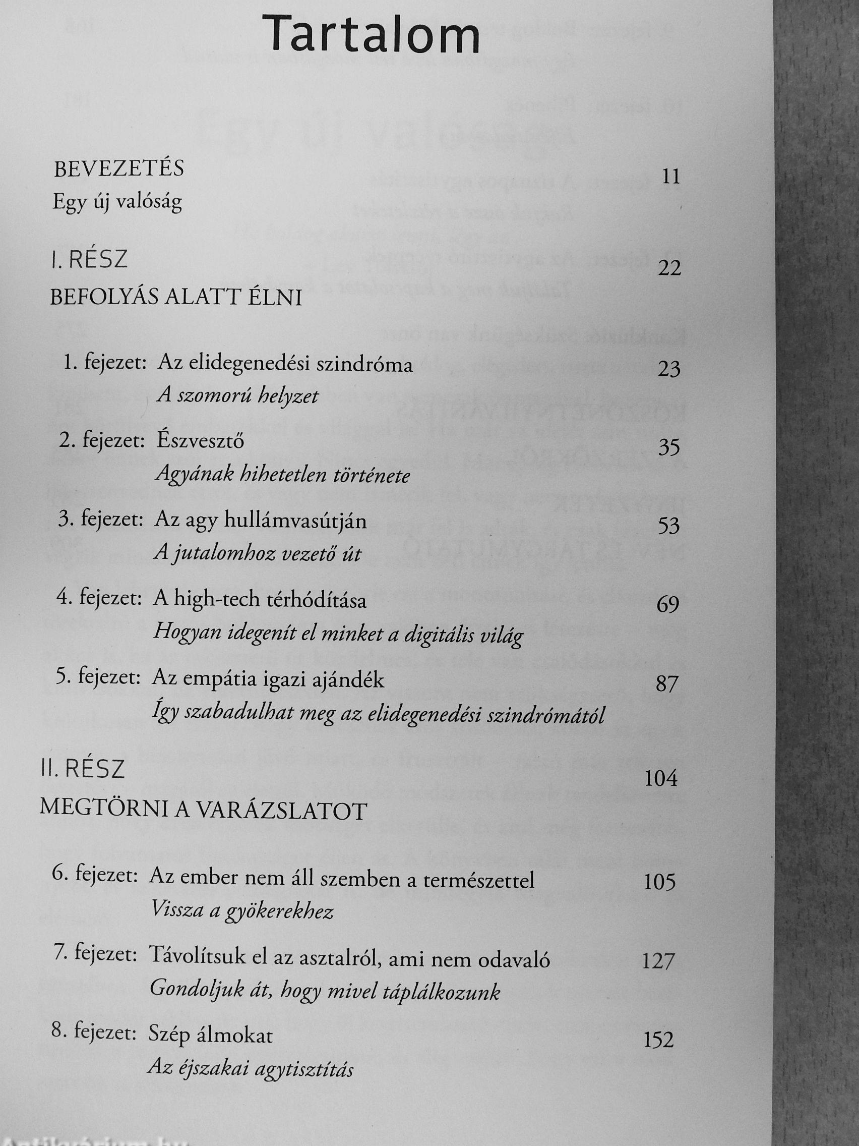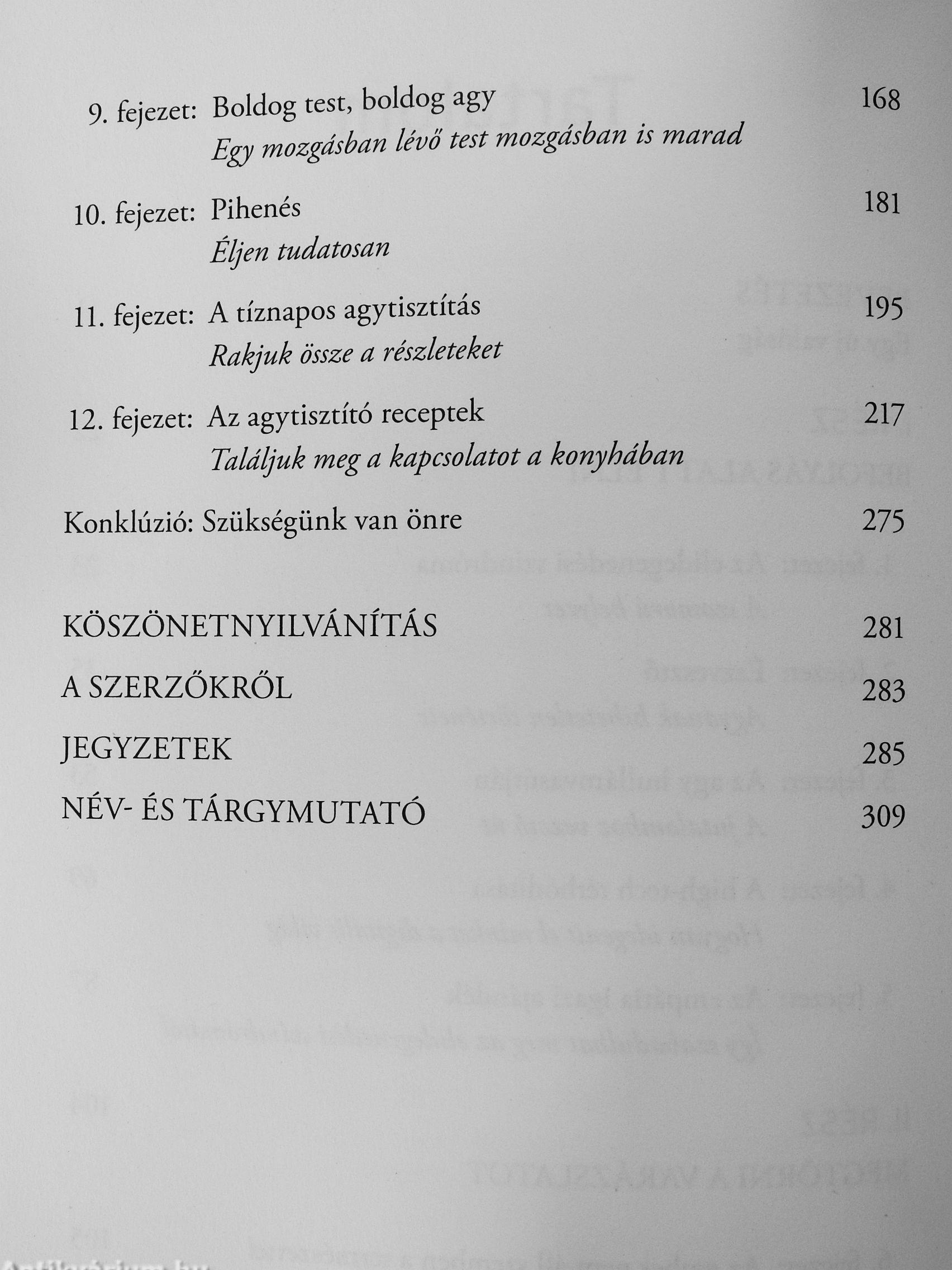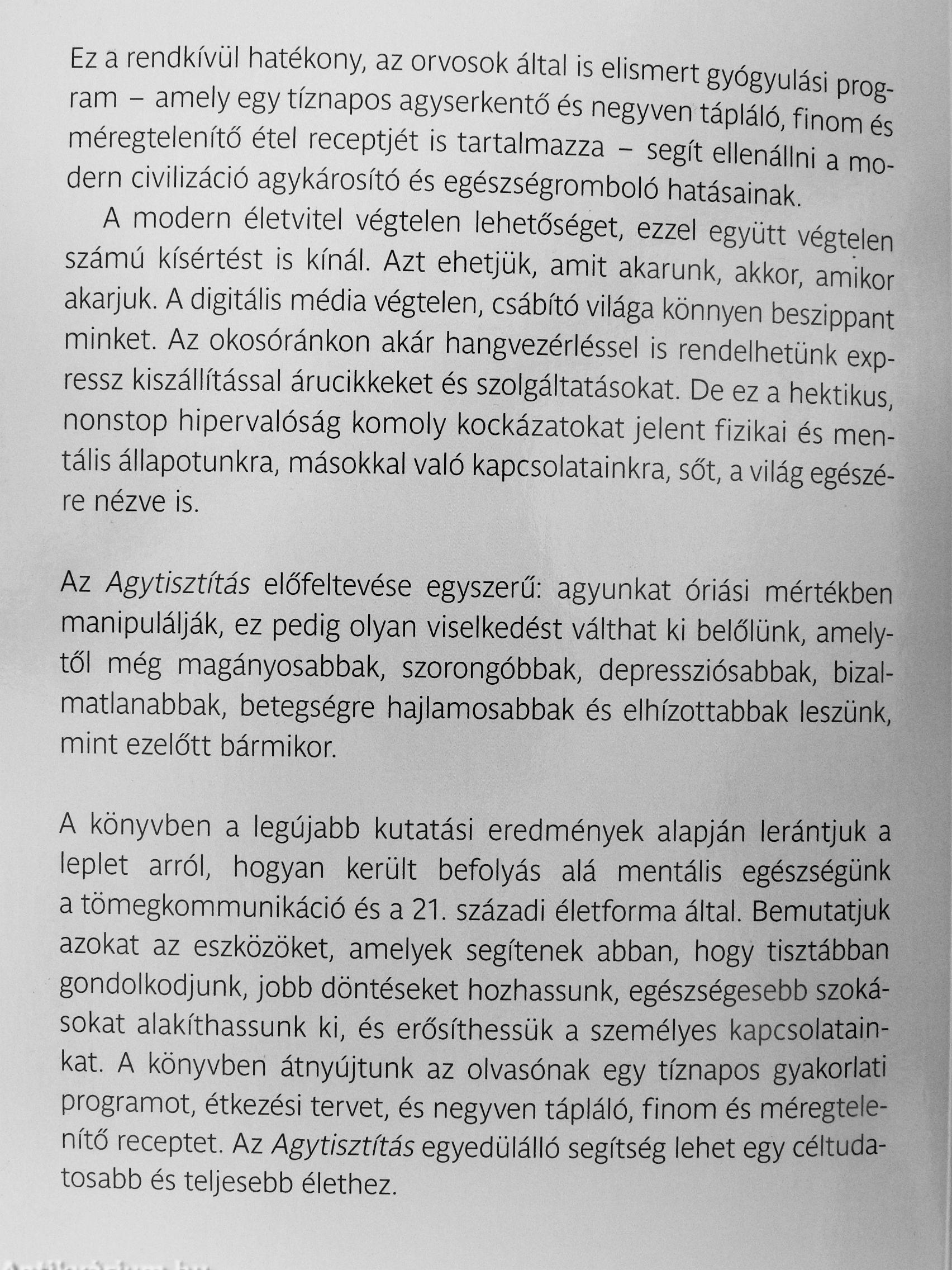 A könyvben a legújabb kutatási eredmények alapján lerántjuk a leplet arról, hogyan került befolyás alá mentális egészségünk a tömegkommunikáció és a 21. századi életforma által. Bemutatjuk azokat az eszközöket, amelyek segítenek abban, hogy tisztábban gondolkodjunk, jobb döntéseket hozhassunk, egészségesebb szokásokat alakíthassunk ki, és erősíthessük a személyes kapcsolatainkat. A könyvben átnyújtunk az olvasónak egy tíznapos gyakorlati programot, étkezési tervet, és negyven tápláló, finom és méregtelenítő receptet. Az Agytisztítás egyedülálló segítség lehet egy céltudatosabb és teljesebb élethez.