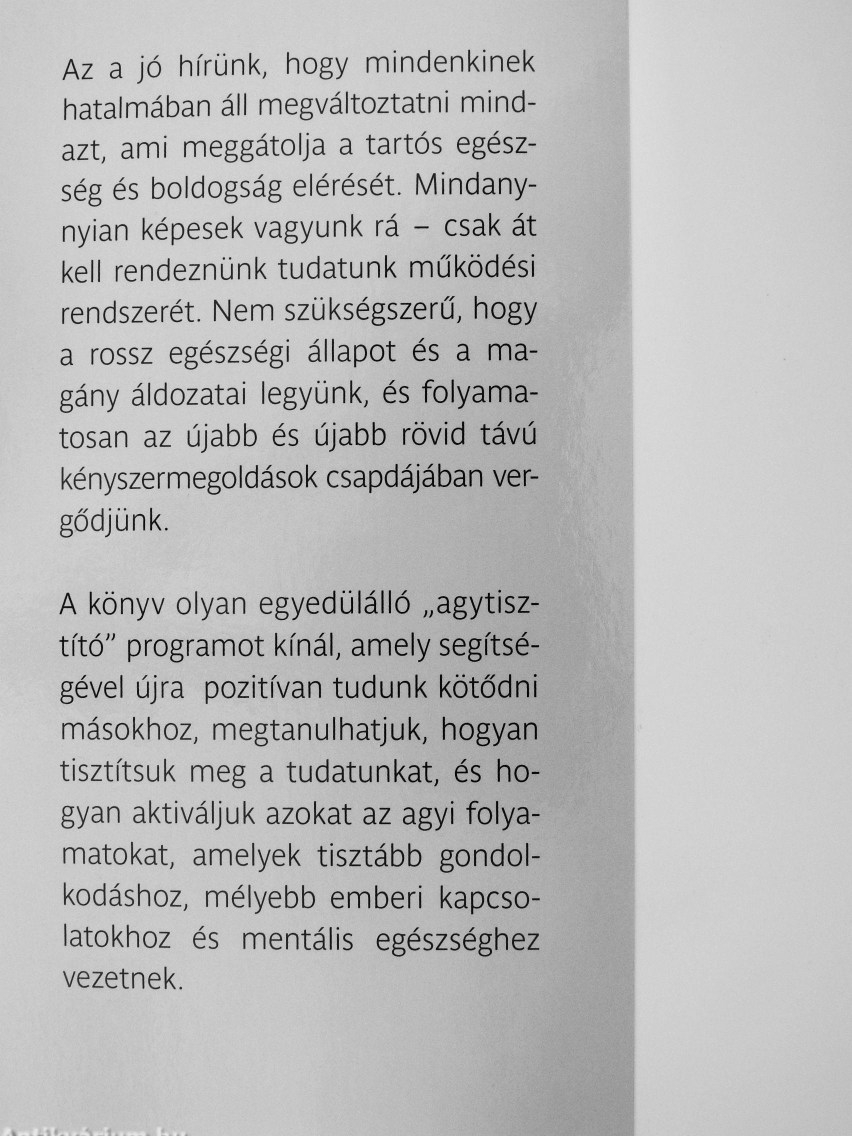 Az a jó hírünk, hogy mindenkinek hatalmában áll megváltoztatni mindazt ami meggátolja a tartós egészség és boldogság elérését. Mindany-nyian képesek vagyunk rá - csak át kell rendeznünk tudatunk működési rendszerét. Nem szükségszerű, hogy a rossz egészségi állapot és a magány áldozatai legyünk, és folyamatosan az újabb és újabb rövid távú kényszermegoldások csapdájában vergődjünk.