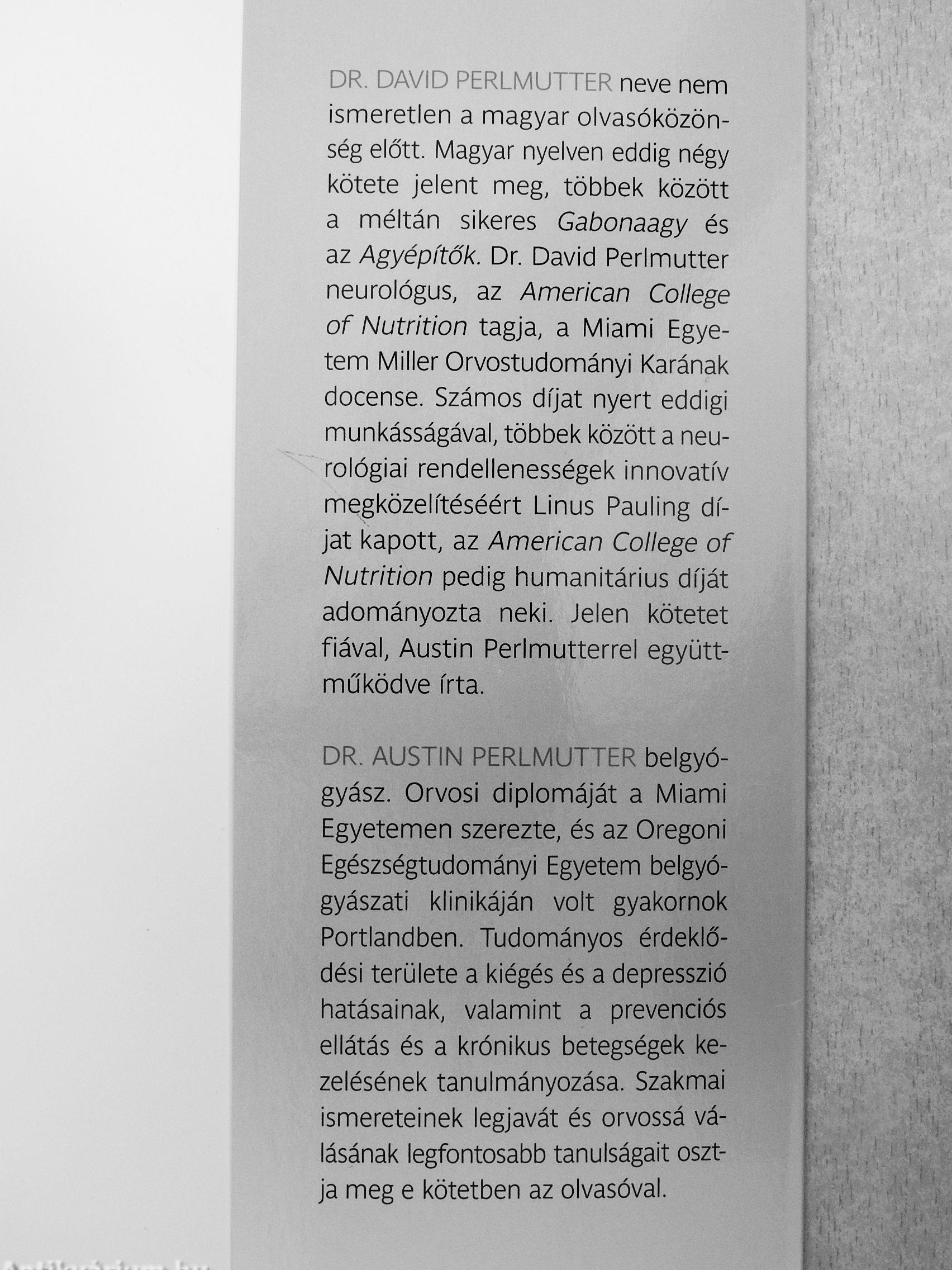 DR. DAVID PERLMUTTER neve nem ismeretlen a magyar olvasóközönség előtt. Magyar nyelven eddig négy kötete jelent meg, többek között a méltán sikeres Gabonaagy és az Agyépftők. Dr. David Perlmutter neurológus, az American College of Nutritlon tagja, a Miami Egyetem Miller Orvostudományi Karának docense. Számos díjat nyert eddigi munkásságával, többek között a neurológiai rendellenességek innovatív megközelítéséért Linus Pauling díjat kapott, az American College of Nutrition pedig humanitárius díját adományozta neki. Jelen kötetet fiával, Austin Perimutterrel együttműködve írta.