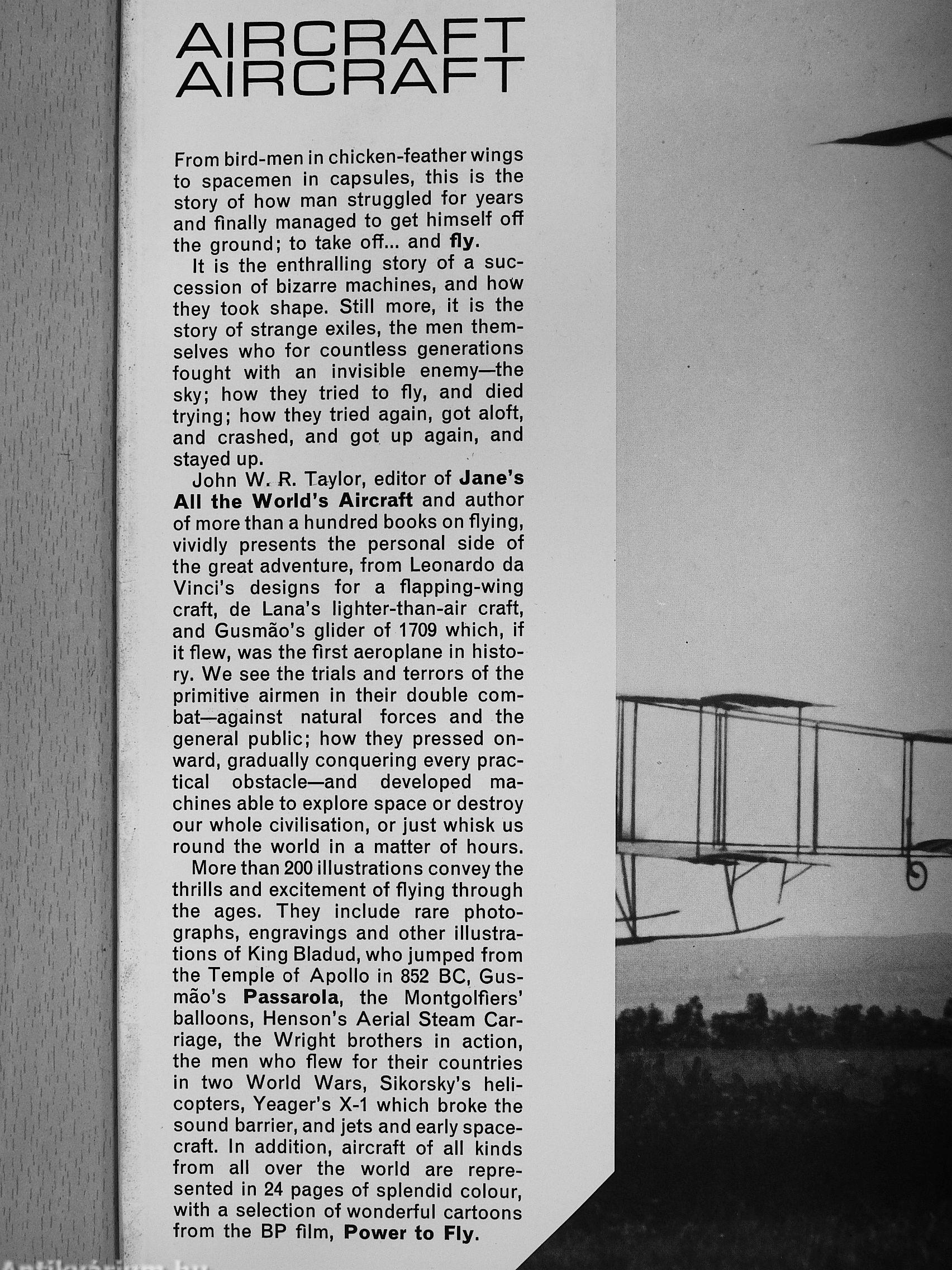 More than 200 illustrations convey the thrills and excitement of flying through the ages. They include rare photographs, engravings and other Illustrations of King Bladud, who jumped from the Temple of Apollo in 852 BC, Gusmao's Passarola, the Montgolfiers' balloons, Henson's Aerial Steam Carriage, the Wright brothers In action, the men who flew for their countries In two World Wars, Sikorsky's hell-copters, Yeager's X-1 which broke the sound barrier, and jets and early spacecraft. In addition, aircraft of all kinds from all over the world are represented In 24 pages of splendid colour, with a selection of wonderful cartoons from the BP film. Power to Fly.