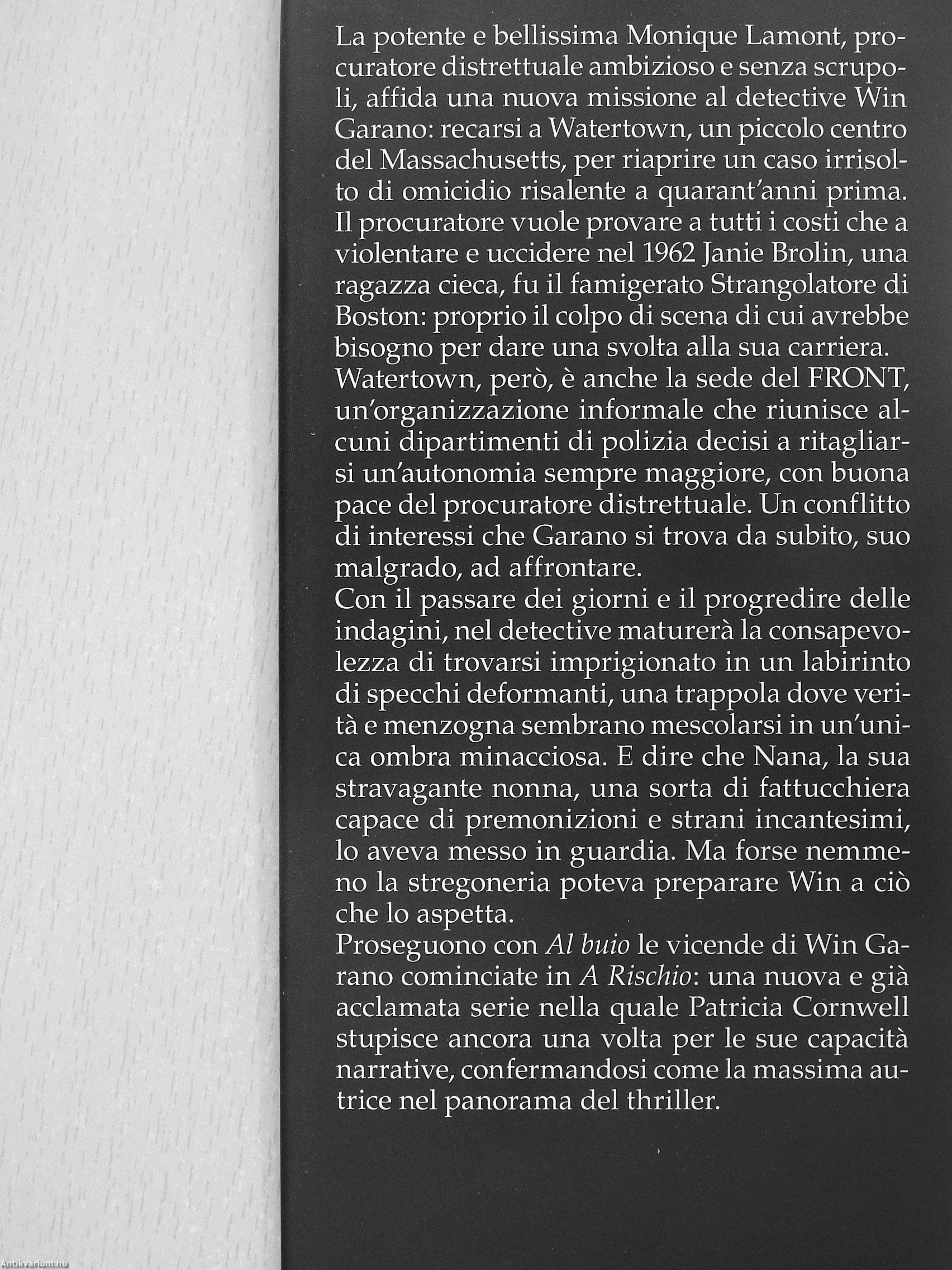 Proseguono con Al buio le vicende di Win Garano cominciate in A Rischio: una nuova e gia acclamata serie nella quale Patricia Cornwell stupisce ancora una volta per le sue capacita narrative, confermandosi come la massima au-trice nel panorama del thriller.