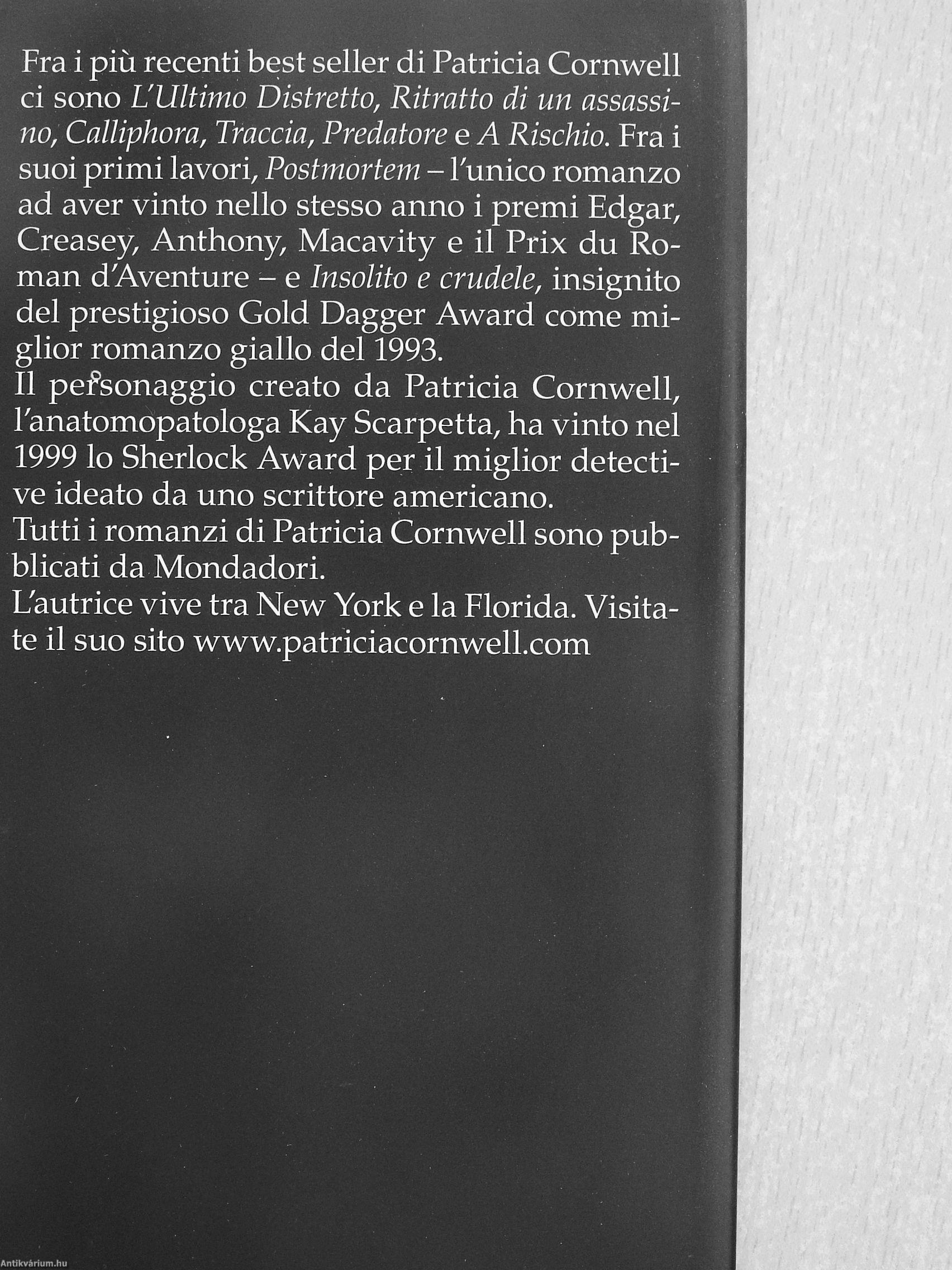 Fra i piu recenti best seller di Patricia Cornwell ci sono L'Ultimo Distretto, Ritratto di un assassi-no, Calliphora, Traccia, Predatore e A Rischio. Fra i suoi primi lavori. Postmortem - l'unico romanzo ad aver vinto nello stesso anno i premi Edgar, Creasey, Anthony, Macavity e il Prix du Roman d'Aventure - e Insolito e crudele, insignito del prestigioso Gold Dagger Award come mi-glior romanzo giallo del 1993. II pefsonaggio creato da Patricia Cornwell, I'anatomopatologa Kay Scarpetta, ha vinto nel 1999 lo Sherlock Award per il miglior detective ideato da uno scrittore americano. Tutti i romanzi di Patricia Cornwell sono pubblicati da Mondadori.