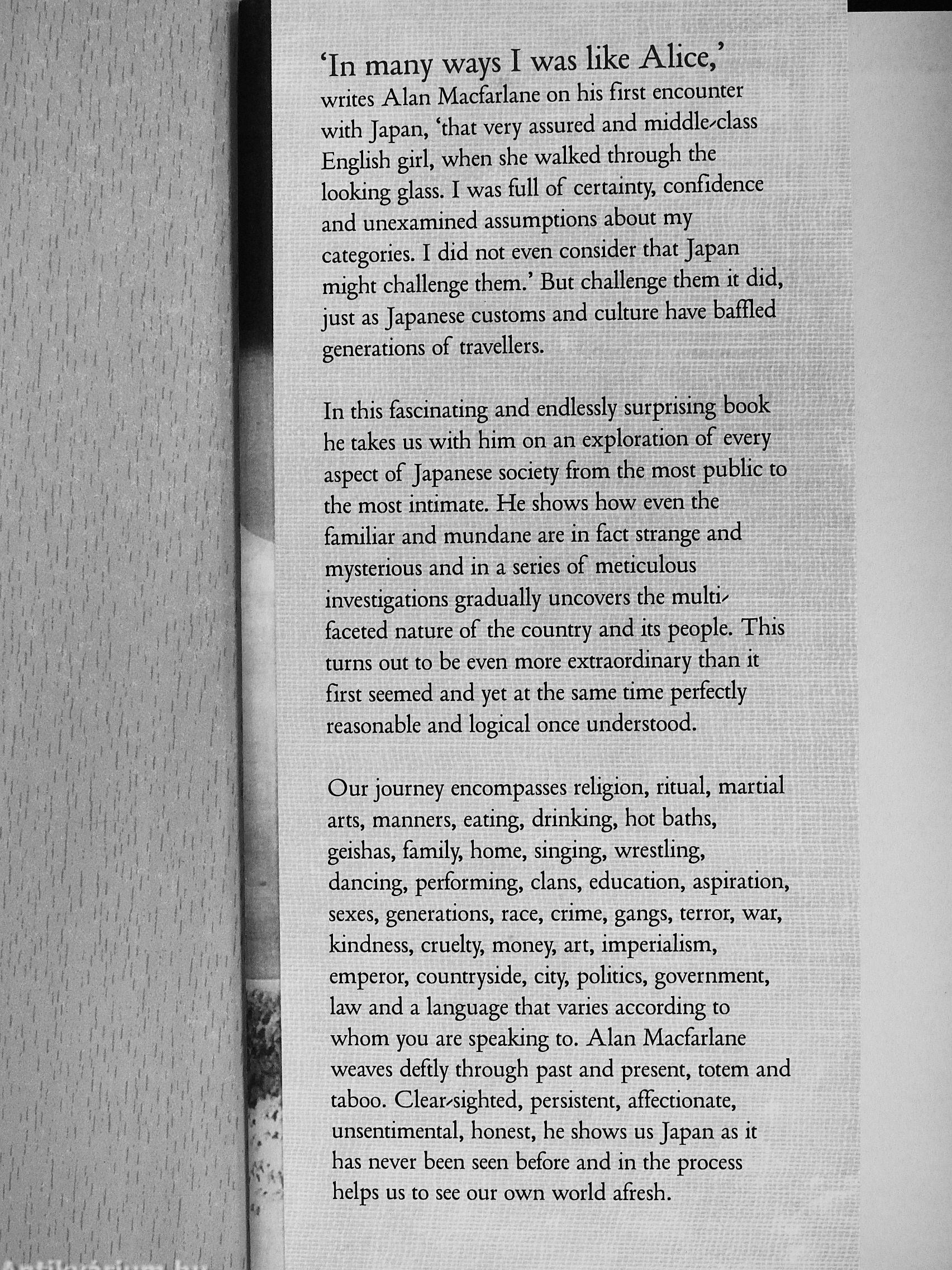 Our journey encompasses religion, ritual, martial arts, manners, eating, drinking, hot baths, geishas, family, home, singing, wrestling, dancing, performing, clans, education, aspiration, sexes, generations, race, crime, gangs, terror, war, kindness, cruelty, money, art, imperialism, emperor, countryside, city, politics, government, law and a language that varies according to whom you are speaking to. Alan Macfarlane weaves defdy through past and present, totem and taboo. Clear-sighted, persistent, affectionate, unsentimental, honest, he shows us Japan as it has never been seen before and in the process helps us to see our own world afresh.