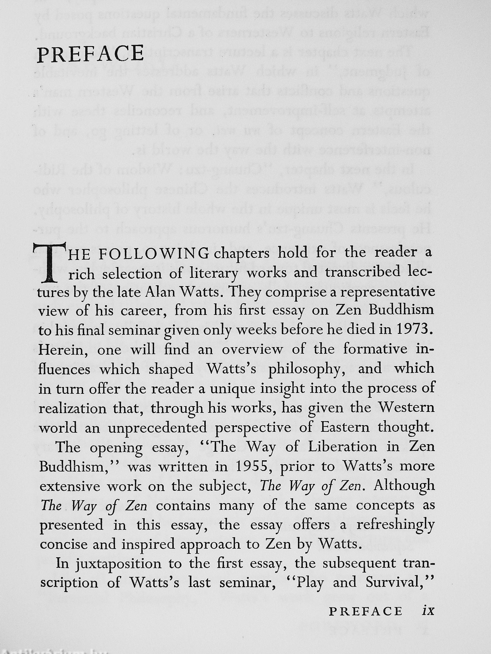 Alan Watts wrote this in 19J5, in preparation for publishing the now classic Way of Zen. Between that time and his death he both learned and unlearned a great deal more about Zen and life.