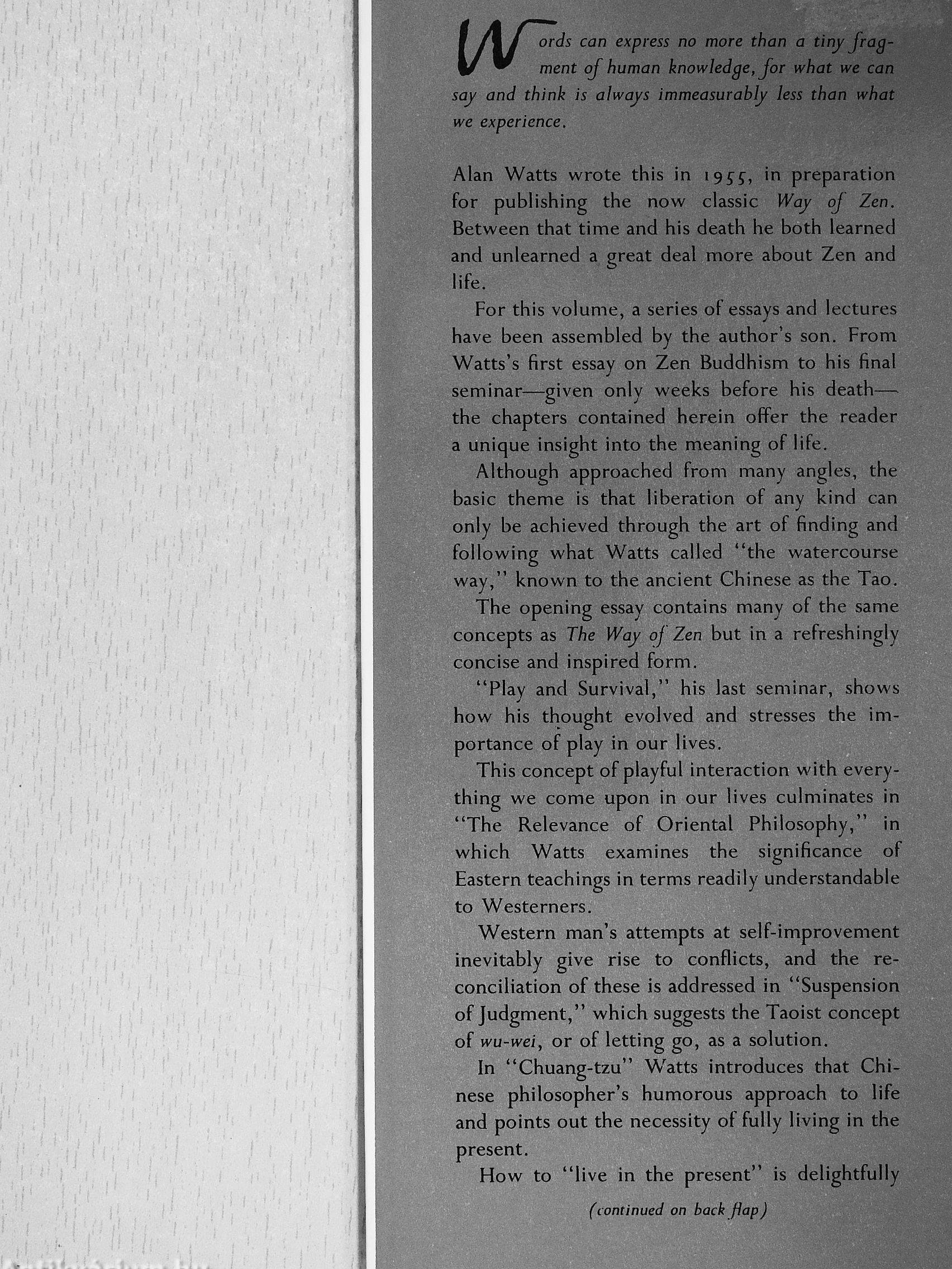 This concept of playful interaction with everything we come upon in our lives culminates in "The Relevance of Oriental Philosophy," in which Watts examines the significance of Eastern teachings in terms readily understandable to Westerners.