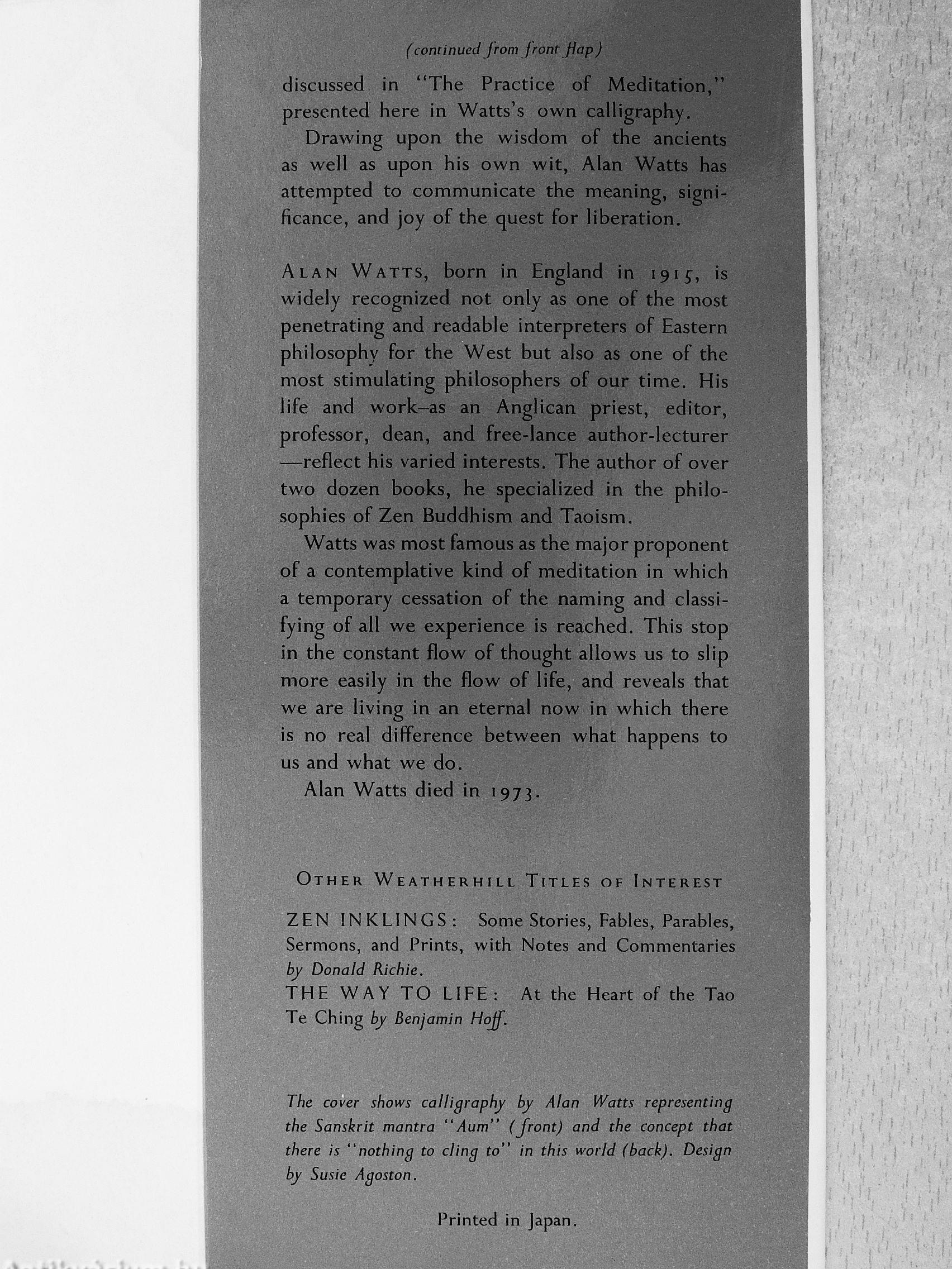 The cover shows calligraphy by Alan Watts representing the Sanskrit mantra " Aum" (front) and the concept that there is "nothing to cling to" in this world (back). Design by Susie Agoston.