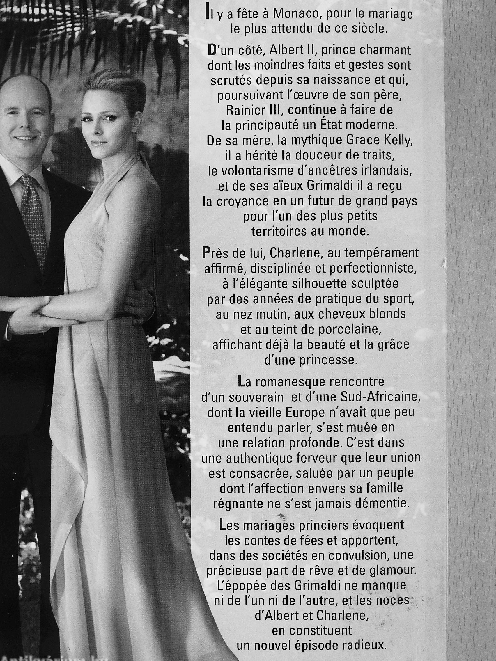 Les mariages princiers évoquent les contes de fées et apportent, dans des sociétés en convulsion, une précieuse part de reve et de glamour. L'épopée des Grimaldi ne manque ni de l'un ni de l'autre, et les noces -d'Albert et Charlene, en constituent