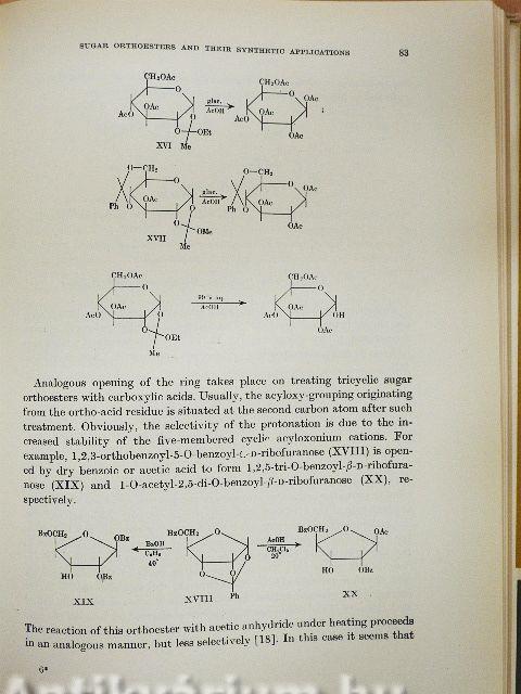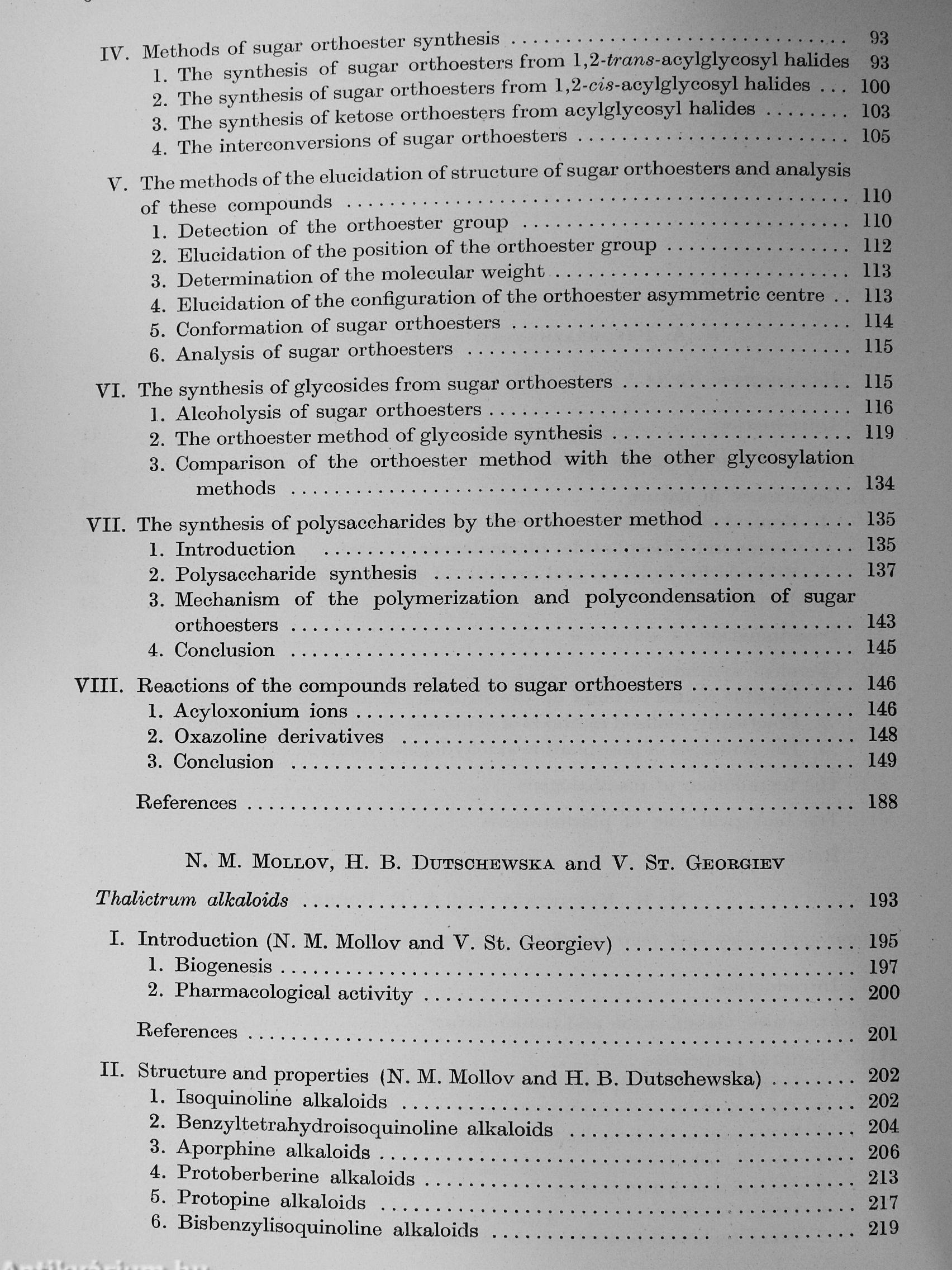 In the part by N. K. Korhetkov and A. F. Bochkov, after a brief historical survey, the types of sugar orthoesters, their system-atization and nomenclature, chemical properties and reactions are discussed. This is followed by a description of the methods of synthesis and analysis of these sugar derivatives, as well as a detailed treatment of structural problems and structure elucidation is given. The great possibilities of applying these compounds in carbohydrate synthesis are pointed out.