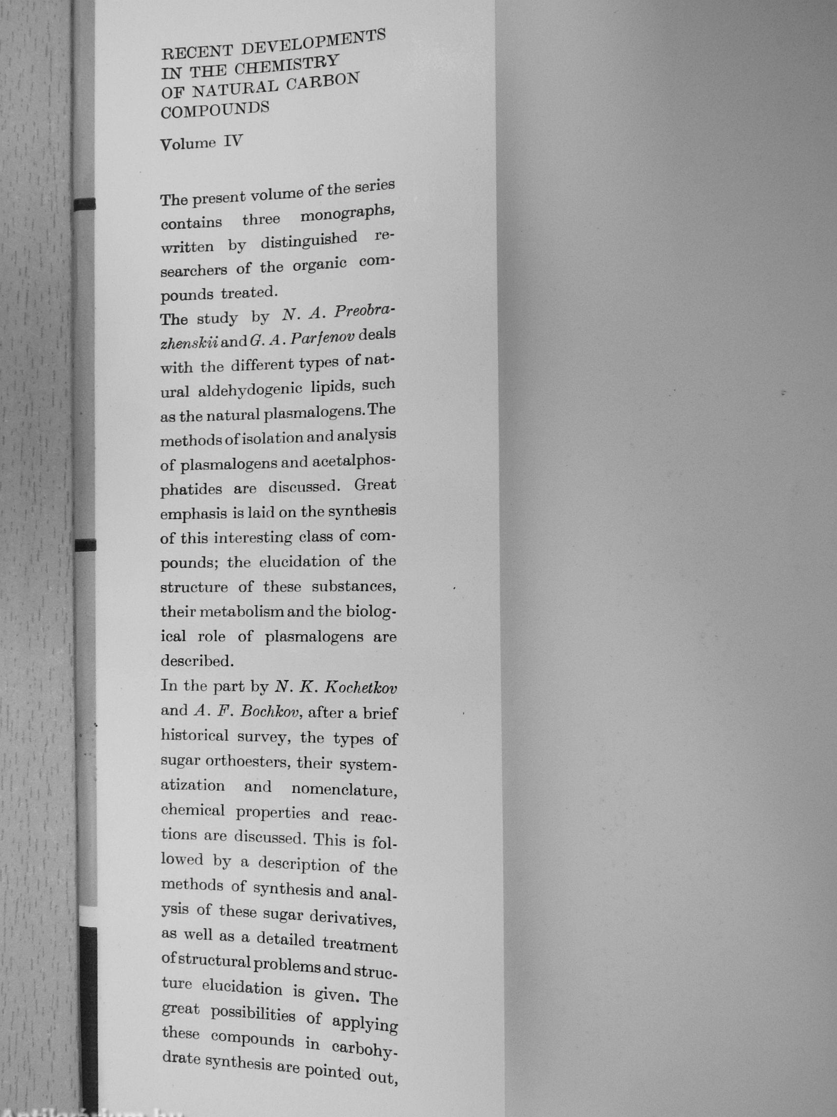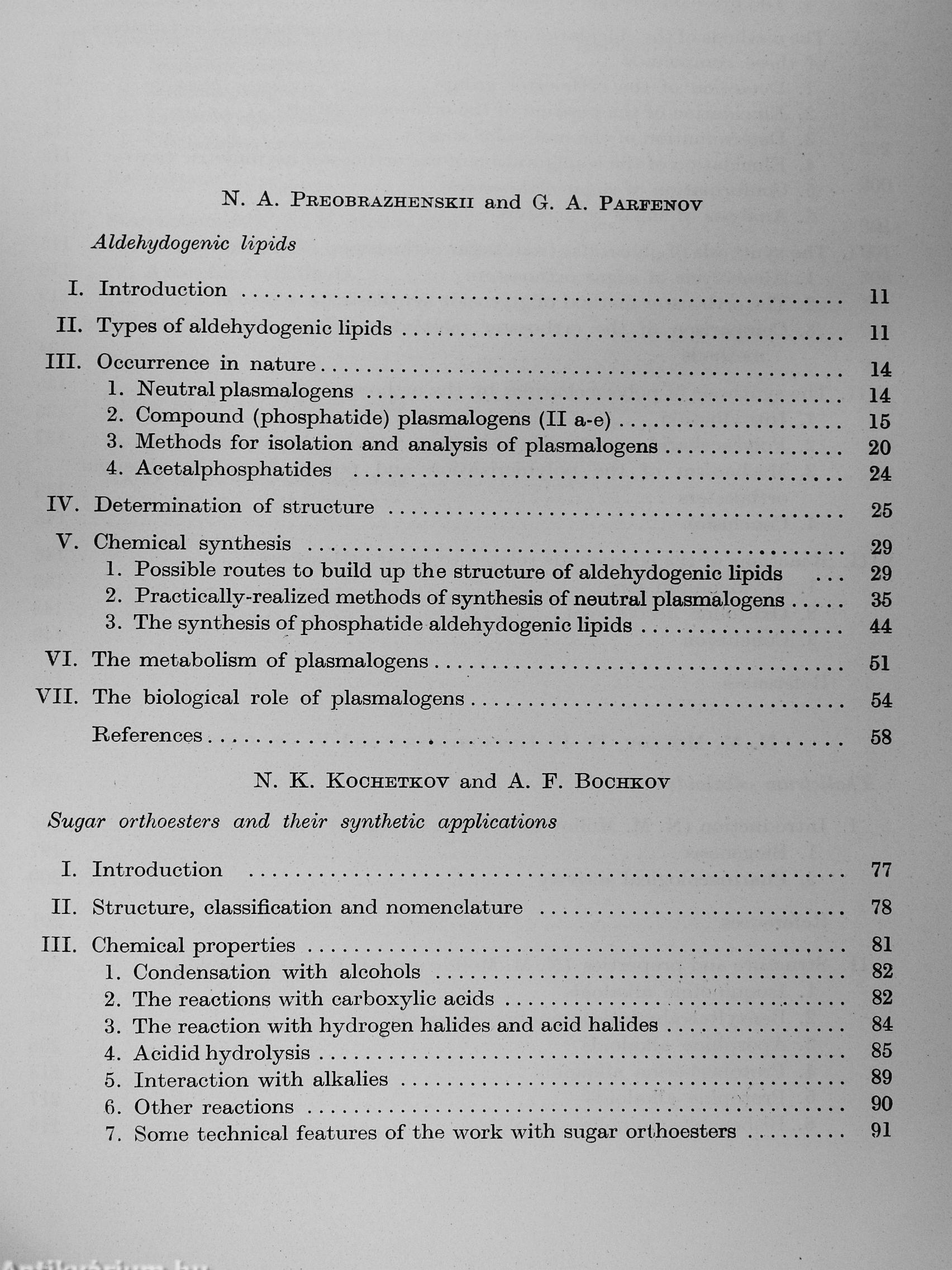In the part by N. K. Korhetkov and A. F. Bochkov, after a brief historical survey, the types of sugar orthoesters, their system-atization and nomenclature, chemical properties and reactions are discussed. This is followed by a description of the methods of synthesis and analysis of these sugar derivatives, as well as a detailed...