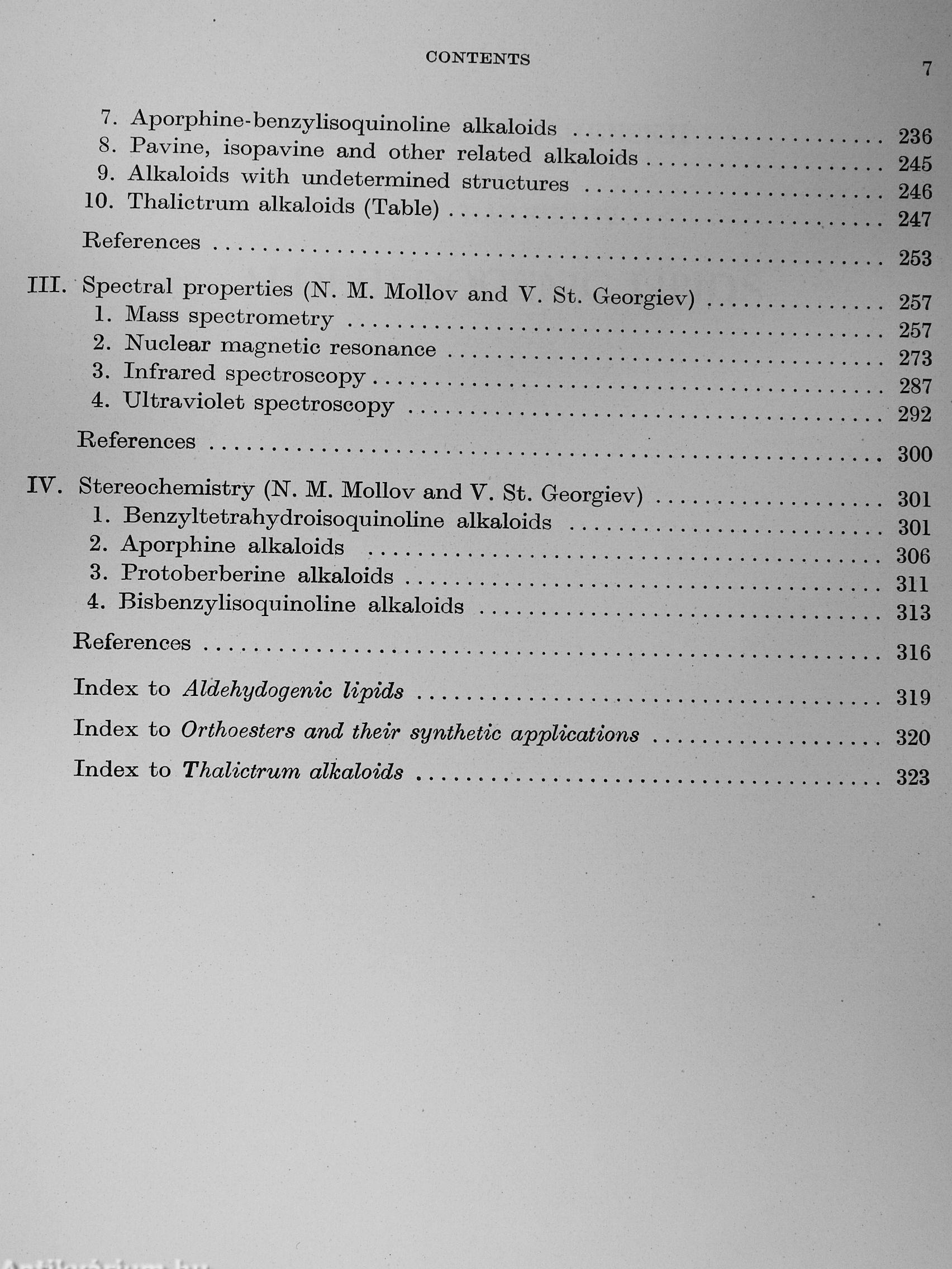 In the introduction of the third monograph, the well-known authors, N. M. Mollov, H. B. Dutschewska and V. St. Georgiev outline the biogenesis and pharmacological activity of Thalictrum alkaloids. The following part deals with the different chemical types of these compounds, such as the isoquino-line, benzyltetrahydroisoquinoline, aporphine, protoberberine, protopine, bisbenzylisoquinoline, pavine, isopavine and other related alkaloids. The discussion includes the spectral (mass, NMR, IR, UV) properties and the stereochemistry of these alkaloids.