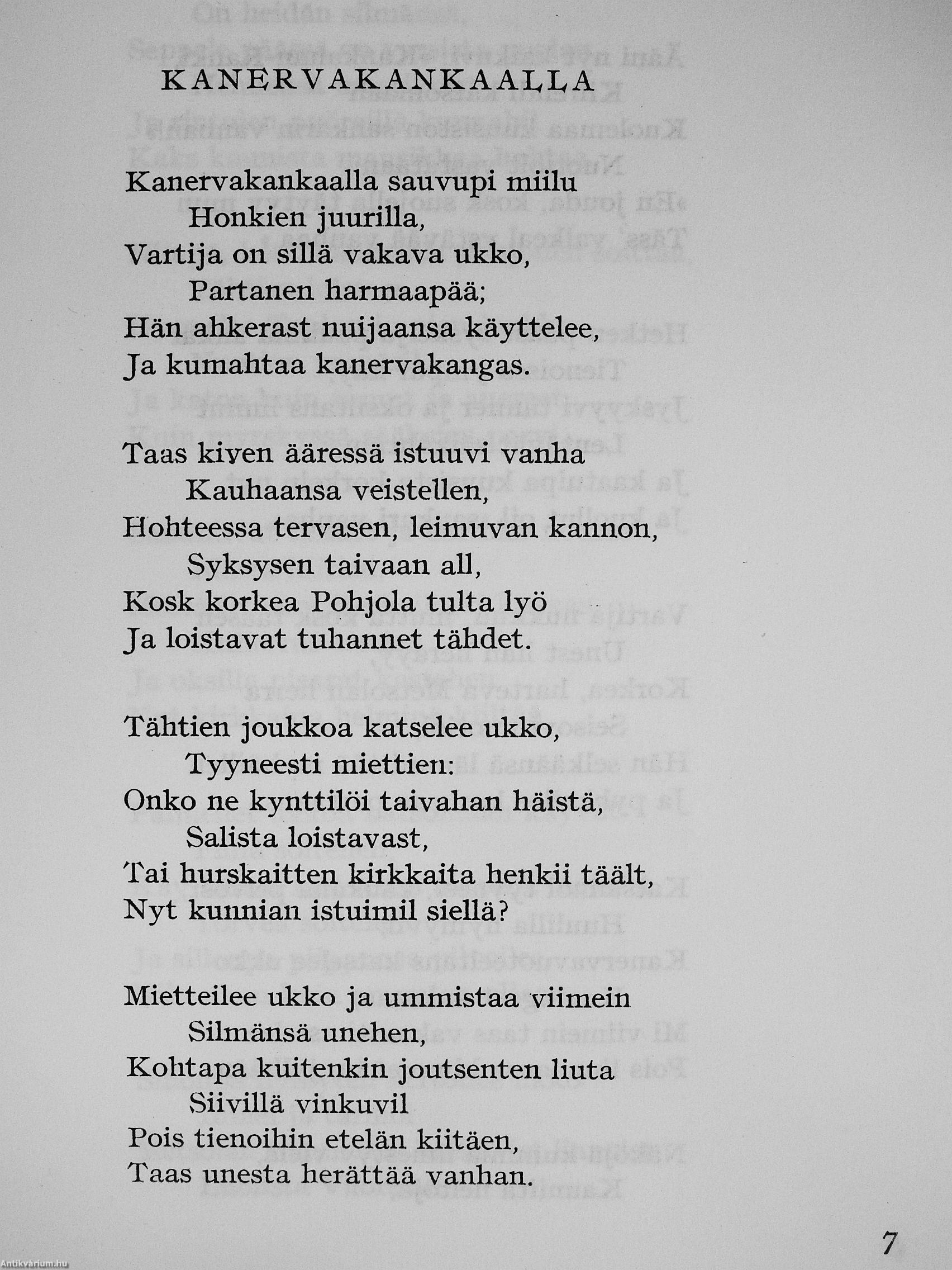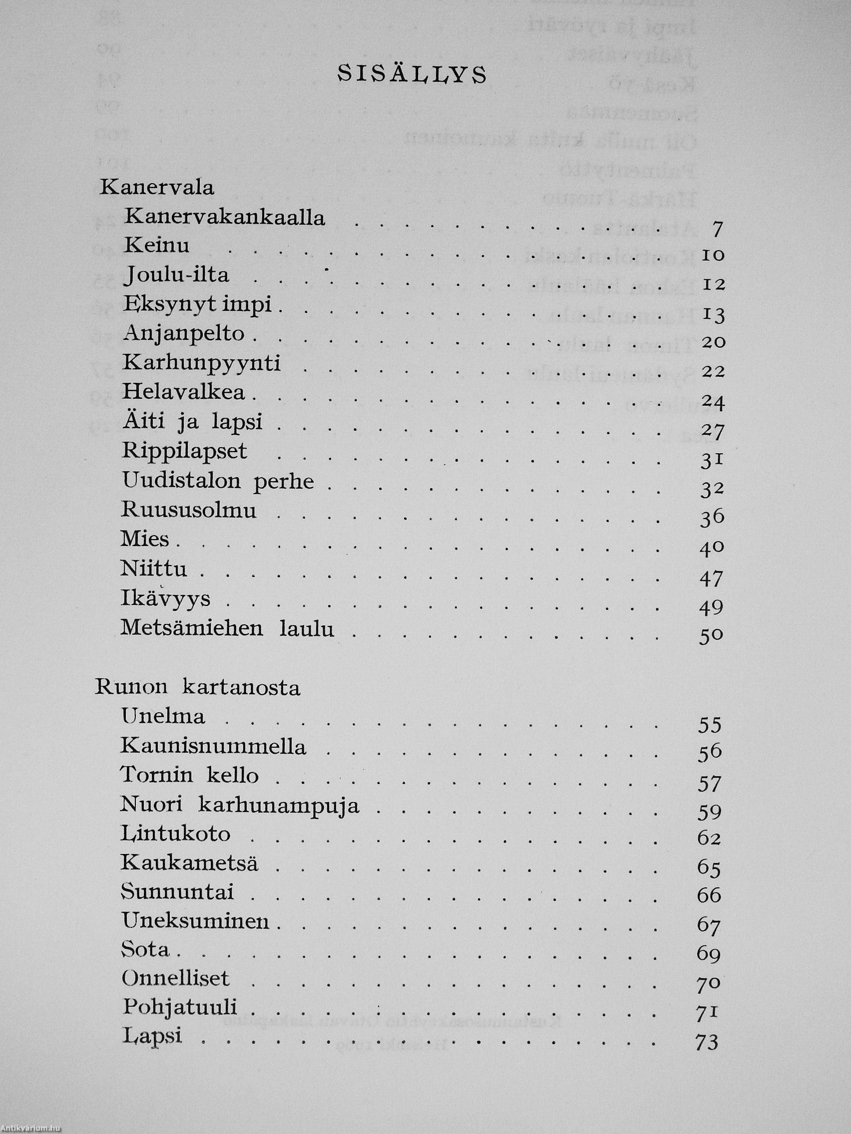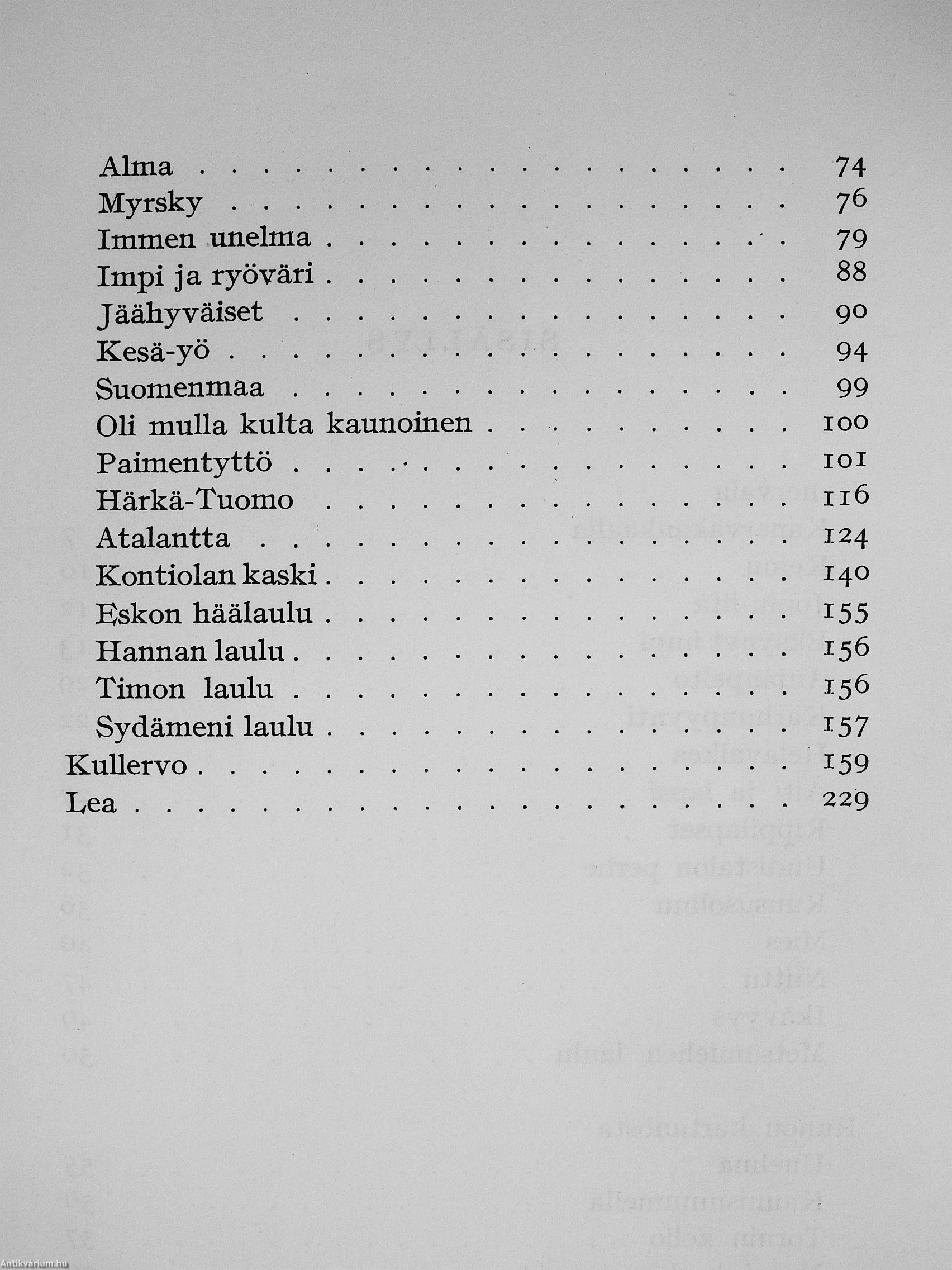 Kanervala ja muita runoja, Kullervo, Lea/Nummisuutarit, Kihlaus, Yö ja päivä, Karkurit, Margareta/Seitsemän veljestä