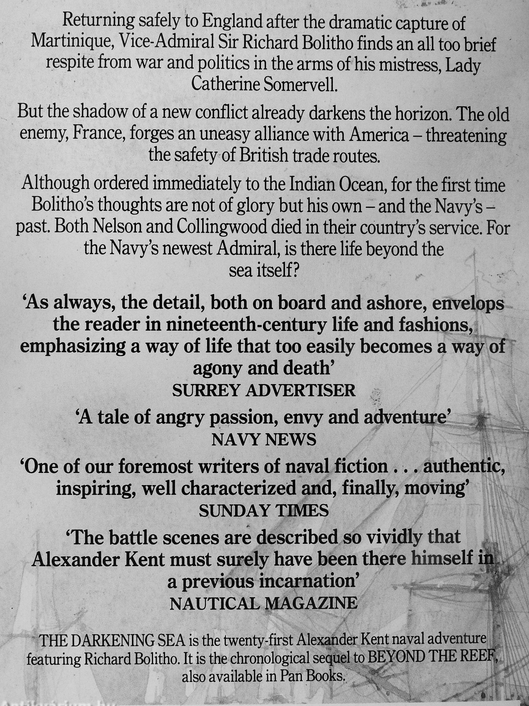 ' THE DARKENING SEA is the twenty-first Alex^der Kent naval adventure featuring Richard Bolitho. It is the chronological sequel to BEYOND THE REE?,