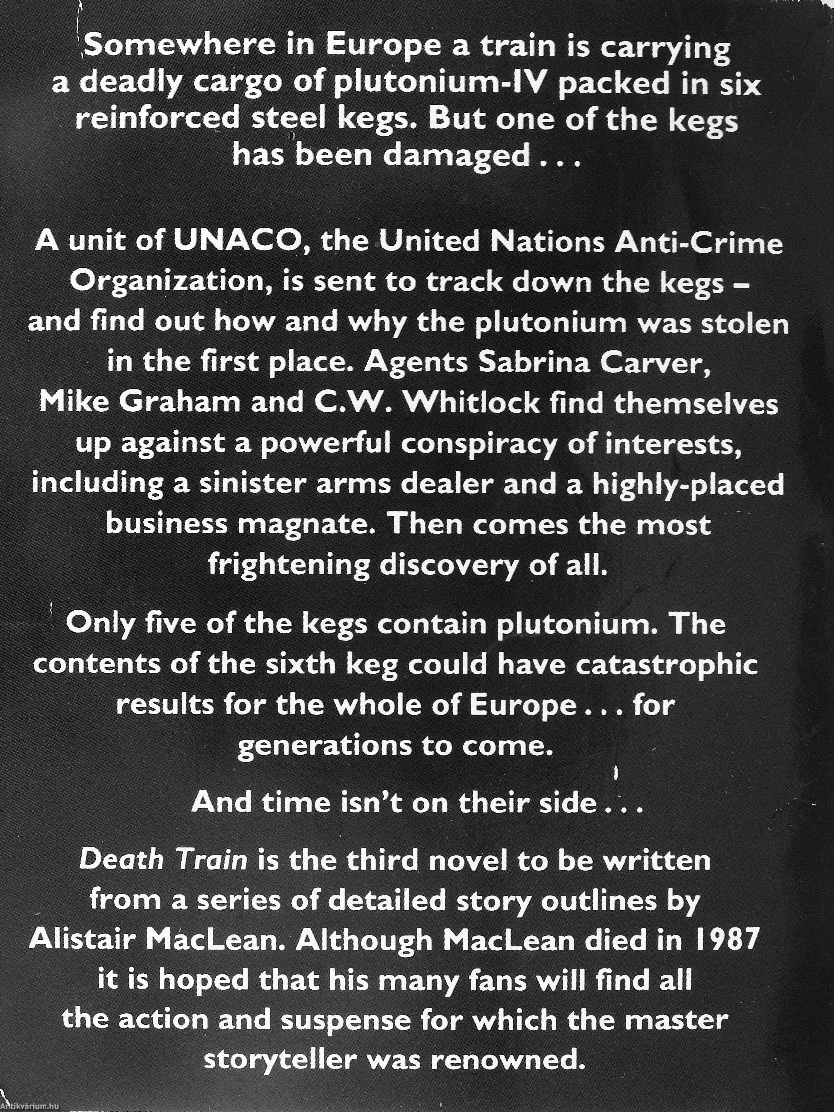 Death Train is the third novel to be written from a series of detailed story outlines by Alistair MacLean. Although MacLean died in 1987 it is hoped that his many fans will find all the action and suspense for which the master storyteller was renowned.
