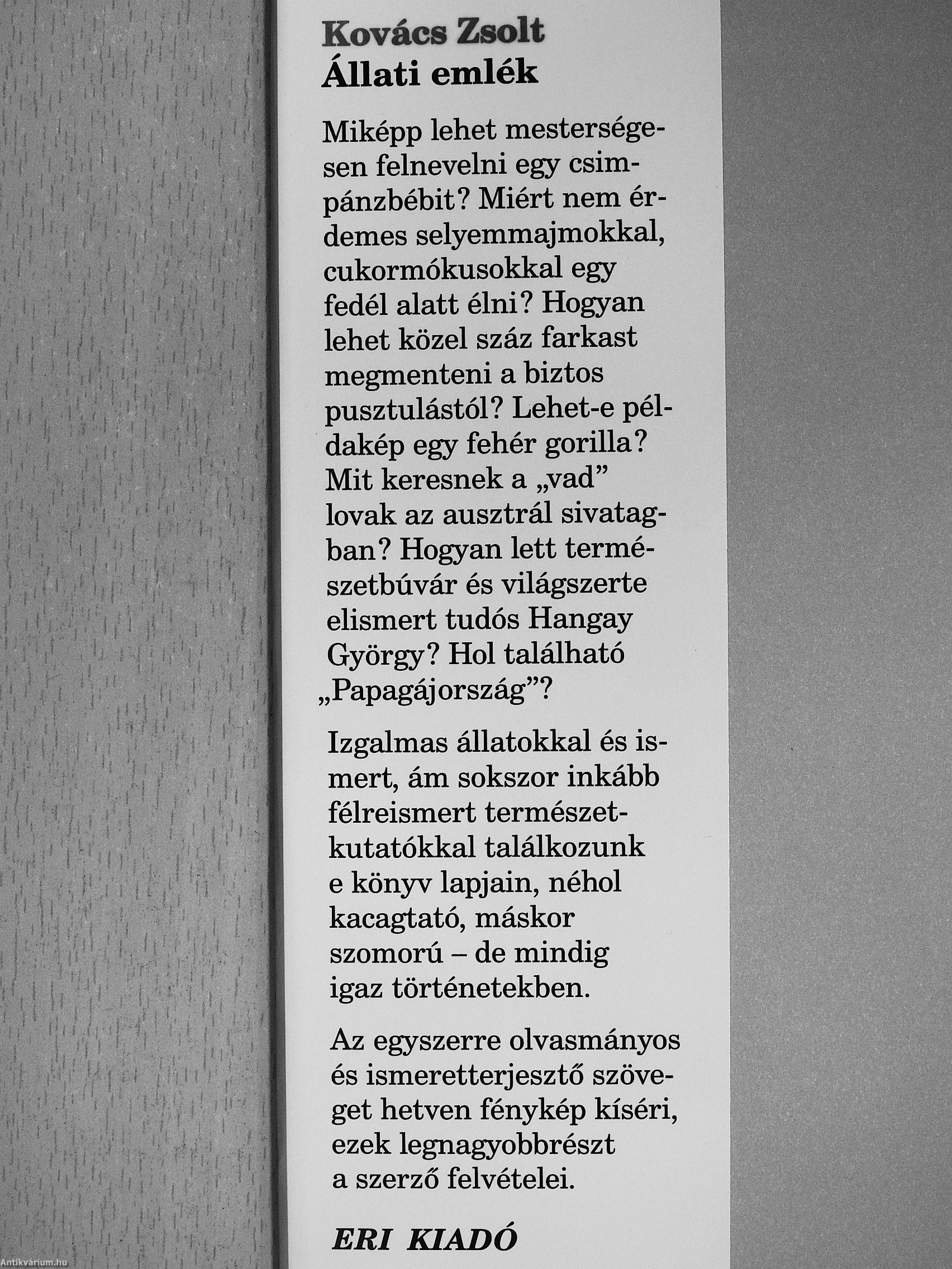 Miképp lehet mesterségesen felnevelni egy csimpánzbébit? Miért nem érdemes selyemmajmokkal, cukormókusokkal egy fedél alatt élni? Hogyan lehet közel száz farkast megmenteni a biztos pusztulástól? Lehet-e példakép egy fehér gorilla? Mit keresnek a „vad" lovak az ausztrál sivatagban? Hogyan lett természetbúvár és világszerte elismert tudós Hangay György? Hol található „Papagáj ország"?
