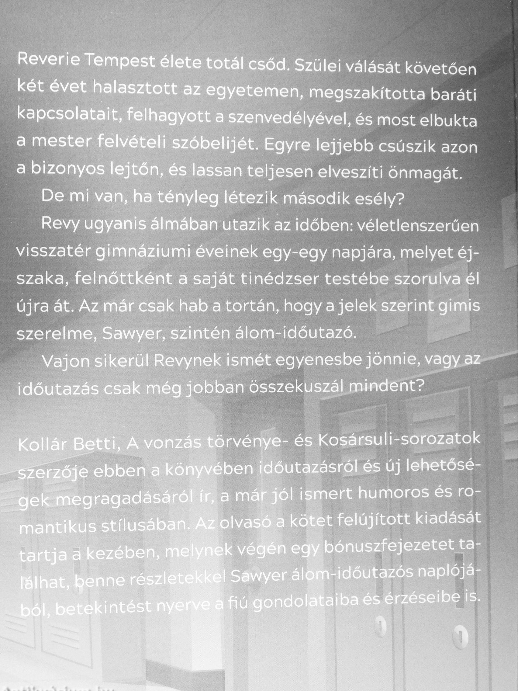 Kollár Betti, A vonzás törvénye- és Kosársuli-sorozatok szerzője ebben a könyvében időutazásról és új lehetőségek megragadásáról ír, a már jól ismert humoros és romantikus stílusában. Az olvasó a kötet felújított kiadását tartja a kezében, melynek végén egy bónuszfejezetet találhat, benne részlete el Sawyer álom-időutazós naplójá-hói K-Pkintést nyerve a fiú gondolataiba és érzéseibe is.