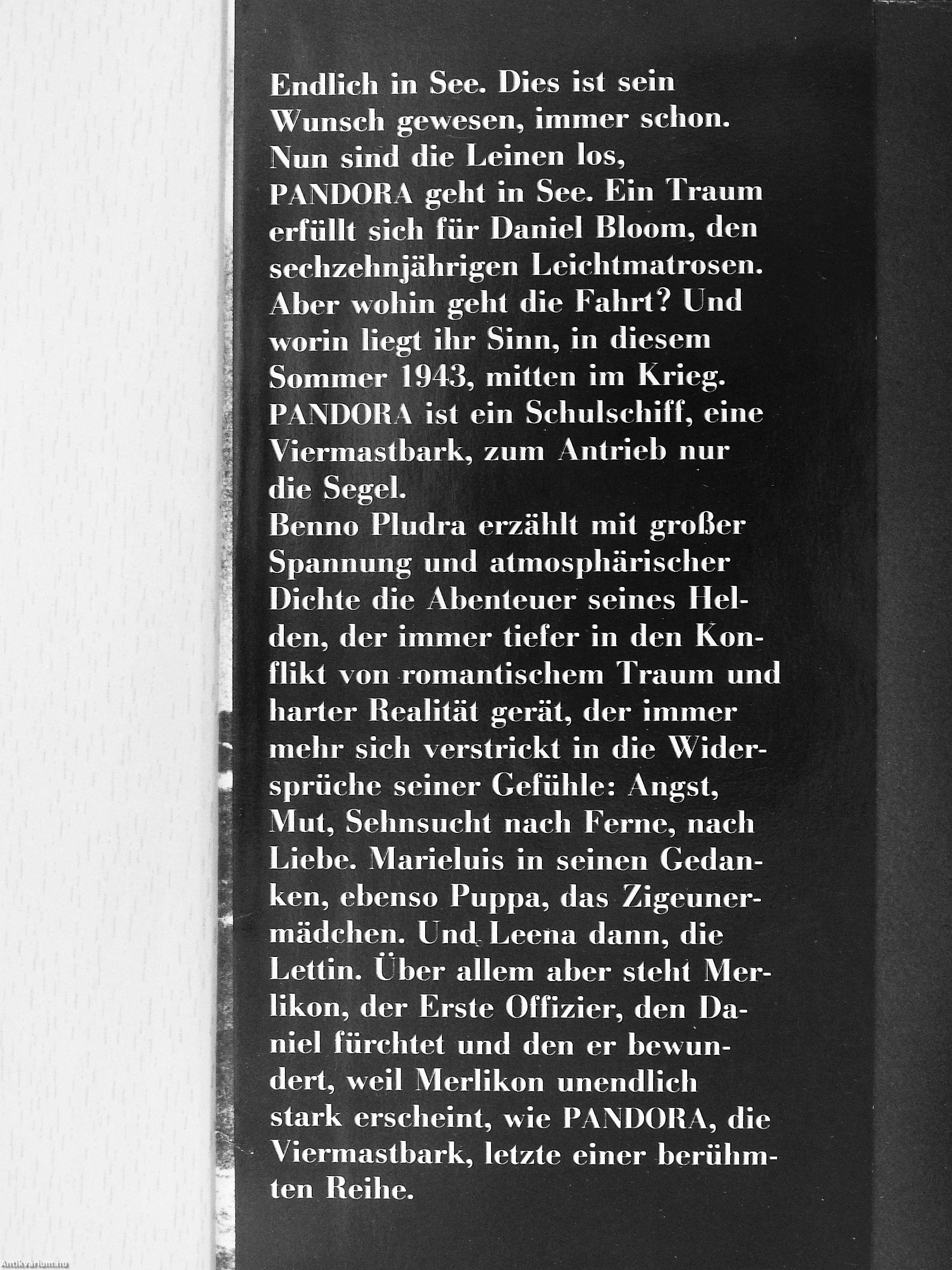 Benno Pludra erzählt mit großer Spannung und atmosphärischer Dichte die Abenteuer seines Helden, der immer tiefer in den Konflikt von romantischem Traum und harter Realität gerät, der immer mehr sich verstrickt in die Widersprüche seiner Gefühle: Angst, Mut, Sehnsucht nach Ferne, nach Liebe. Marieluis in seinen Gedanken, ebenso Puppa, das Zigeuner-mädclien. Und Leena dann, die Lettin. Über allem aber steht Mer-likon, der Erste Offizier, den Daniel fürchtet und den er bewundert, weil Merlikon unendlich stark erscheint, wie PANDORA, die Viermastbark, letzte einer berühmten Reihe.
