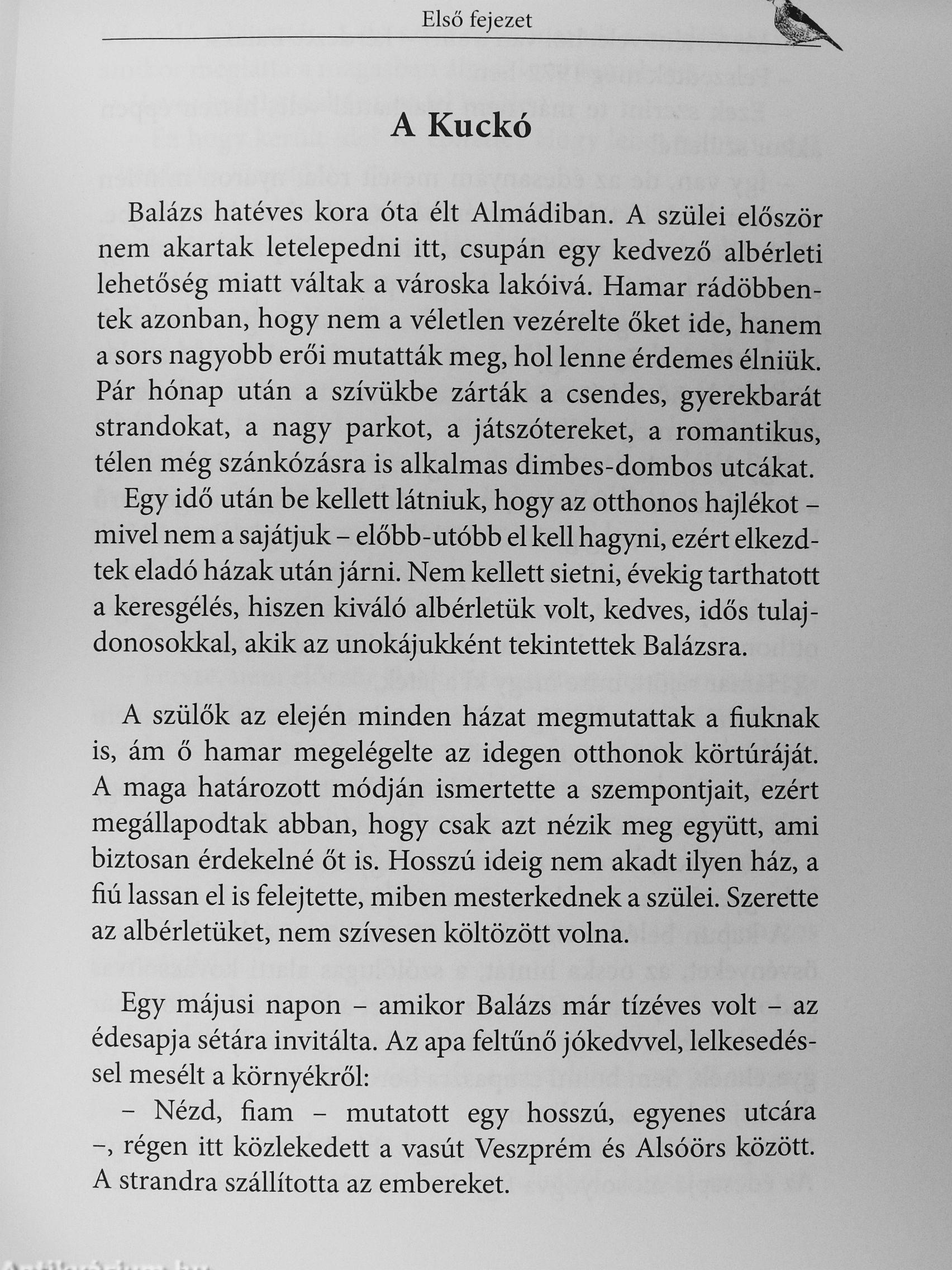 A történettel módfelett tudok azonosulni, én is imádom az antik tárgyakat, mint Balázs, és megszállottan rajongok a búvóhelyekért. Az is csodás, hogy két szálon fut a történet, ez a kettős világ kompozíció briliáns. A szereplők is szerethetőek, nagyon tetszett, hogy Csipesz verebet is belekomponálta a történetbe. Az írás izgalmas hatása egyik fordulatnál sem apad el. Egy gyönyörű mese szépséges tájakkal, szerethető szereplőkkel. (Jófejű Ádám, 13 éves)