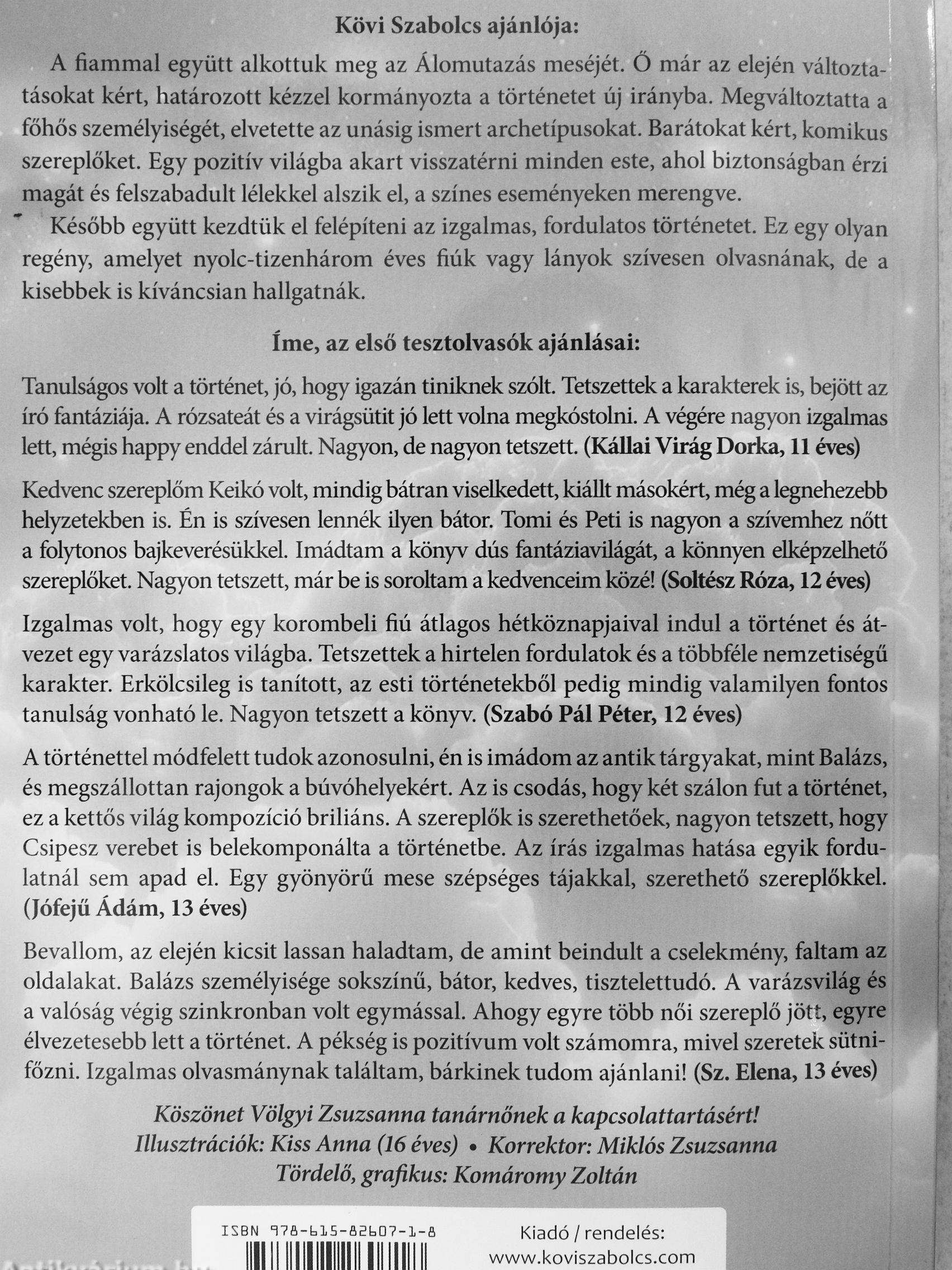 Kövi Szabolcs ajánlója: A fiammal együtt alkottuk meg az Álomutazás meséjét. Ö már az elején változtatásokat kért, határozott kézzel kormányozta a történetet új irányba. Megváltoztatta a főhős személyiségét, elvetette az unásig ismert archetípusokat. Barátokat kért, komikus szereplőket. Egy pozitív világba akart visszatérni minden este, ahol biztonságban érzi magát és felszabadult lélekkel alszik el, a színes eseményeken merengve.