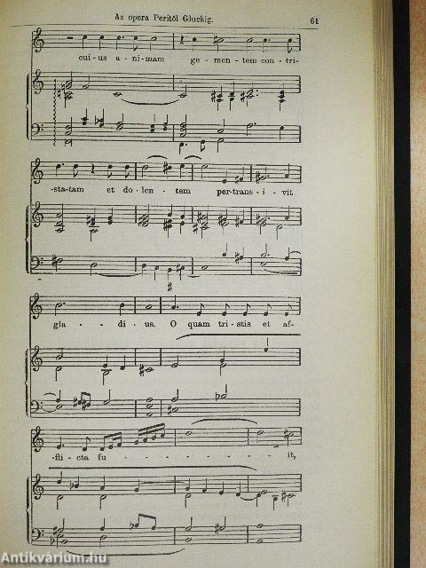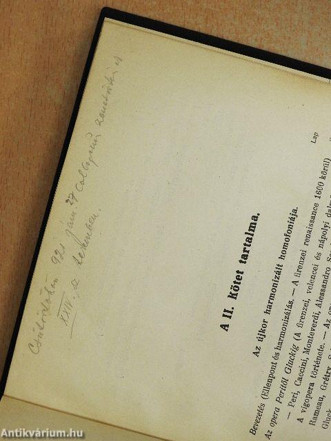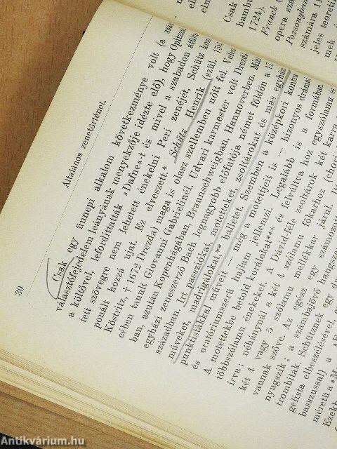 | Az opera Peritől Gluckig (A firenzei, velencei és nápolyi dalmű-szerzők. - Peri, Caccini, Monteverdi, Alessandro Scarlatti, Pergolesi stb. - A vígopera története. - az opera francia és német földön. - Lully, Rameau, Grétry, Schütz, Hiller stb. - Purcell és más angolok. - Gluck. - Hat dallam) | 9 |