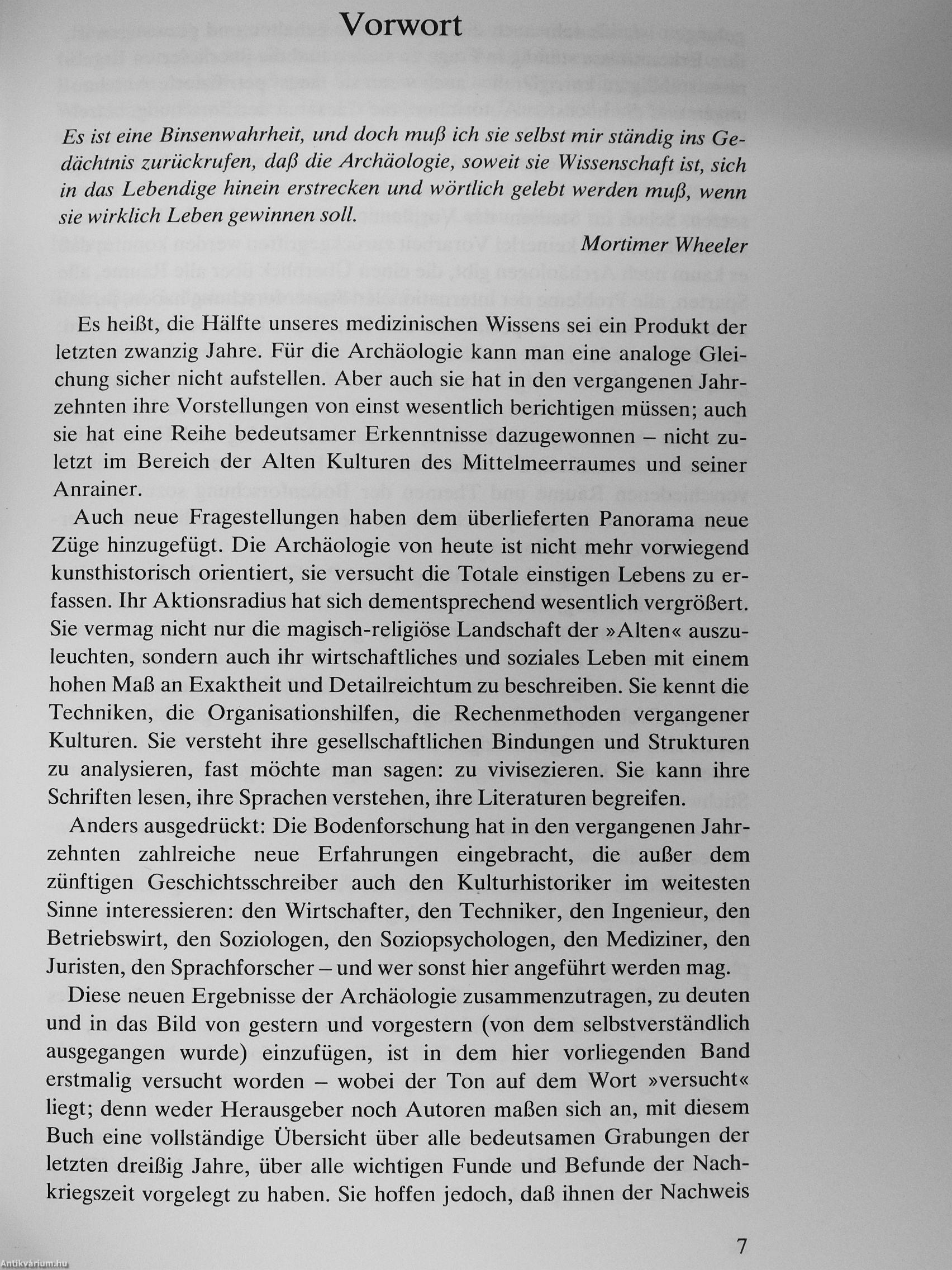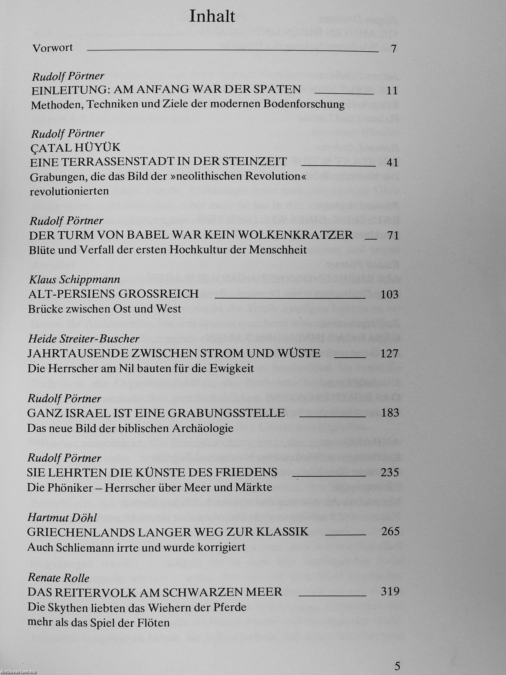 Das Buch beginnt daher mit einem Beitrag, in dem neben den verfeinerten Methoden der modernen Bodenforschung auch ihre veränderten aktuellen Zielsetzungen beschrieben werden. Danach nimmt der Leser an einer imaginären Entdeckungsreise teil, die ihn von der steinzeitlichen Terrassenstadt Catal Hüyük in Anatolien über die Grabungsplätze des Zweistromlandes und Persiens zu den Tempeln, Städten und Pyramiden der Pharaonen nach Ägypten führt. Israel, das Dorado der „biblischen Archäologie", das heute nahezu eine „einzige Grabungsstelle" ist, und der phönikische Raum, der sich über das gesamte Mittelmeer erstreckt, sind die nächsten Stationen dieser Kreuzfahrt, die selbstverständlich auch Griechenland und seinem „langen Weg zur Klassik" sowie dem Imperium Romanum und seinem byzantinischen Nachfolgestaat den gebührenden Raum widmet. Weitere farbige und inhaltreiche Kapitel erhellen das Panorama, das die Altertumskunde heute von der Welt der Skythen, der Etrusker, der Kelten und der Germanen zu entwerfe n vprmijo