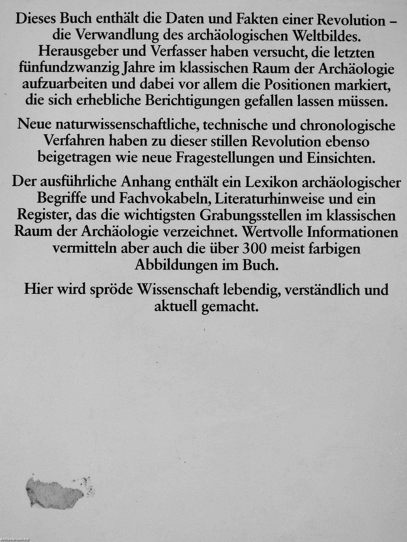 Begriffe und Fachvokabeln, Literaturhinweise und ein Register, das die wichtigsten Grabungsstellen im klassischen Raum der Archäologie verzeichnet. Wertvolle Informationen vermitteln aber auch die über 300 meist farbigen Abbildungen im Buch.