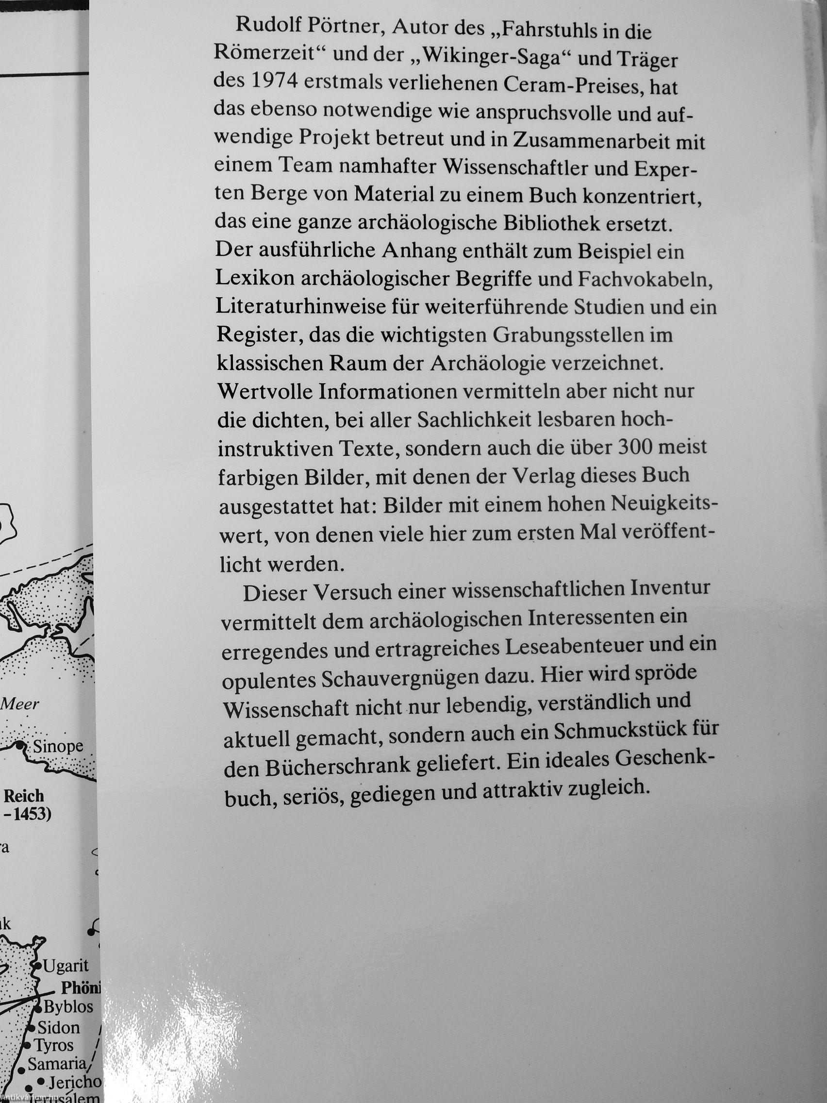 Rudolf Pörtner, Autor des „Fahrstuhls in die Römerzeit" und der „Wikinger-Saga" und Träger des 1974 erstmals verhehenen Ceram-Preises, hat das ebenso notwendige wie anspruchsvolle und aufwendige Projekt betreut und in Zusammenarbeit mit einem Team namhafter Wissenschaftler und Experten Berge von Material zu einem Buch konzentriert, das eine ganze archäologische Bibliothek ersetzt. Der ausführliche Anhang enthält zum Beispiel ein Lexikon archäologischer Begriffe und Fachvokabeln, Literaturhinweise für weiterführende Studien und ein Register, das die wichtigsten Grabungsstellen im klassischen Raum der Archäologie verzeichnet. Wertvolle Informationen vermitteln aber nicht nur die dichten, bei aller Sachüchkeit lesbaren hoch-instruktiven Texte, sondern auch die über 300 meist farbigen Bilder, mit denen der Verlag dieses Buch ausgestattet hat: Bilder mit einem hohen Neuigkeitswert, von denen viele hier zum ersten Mal veröffentlicht werden.